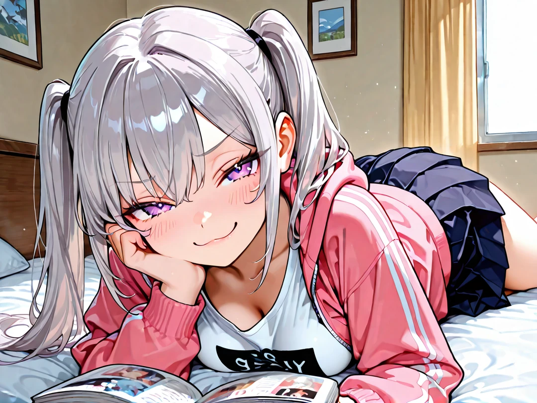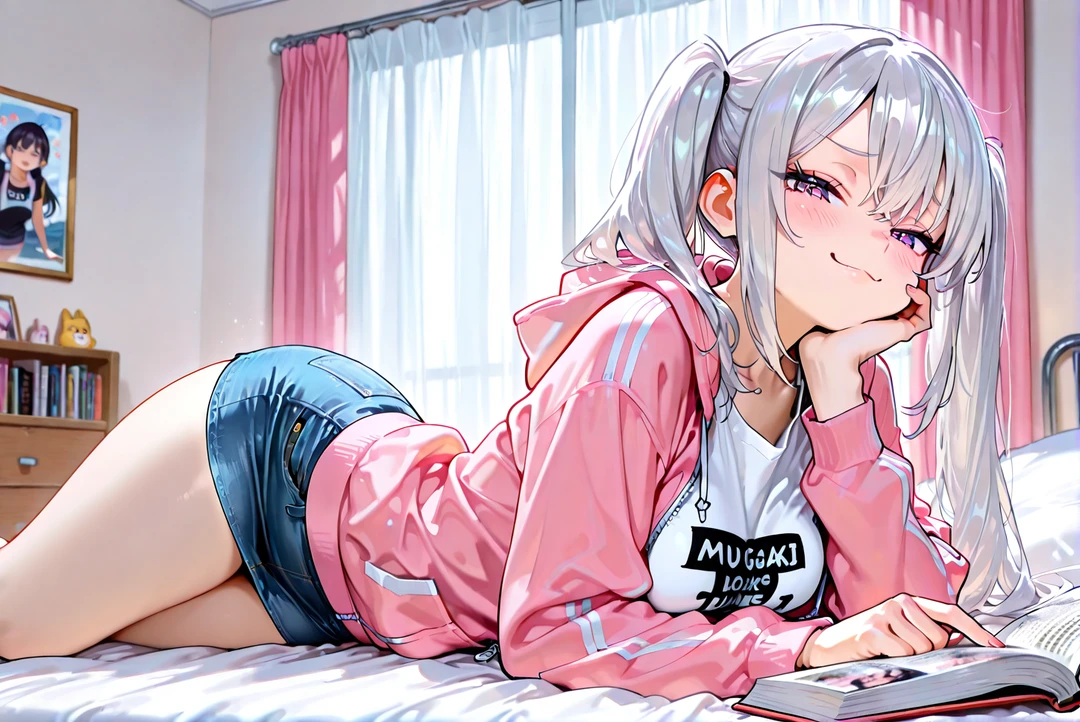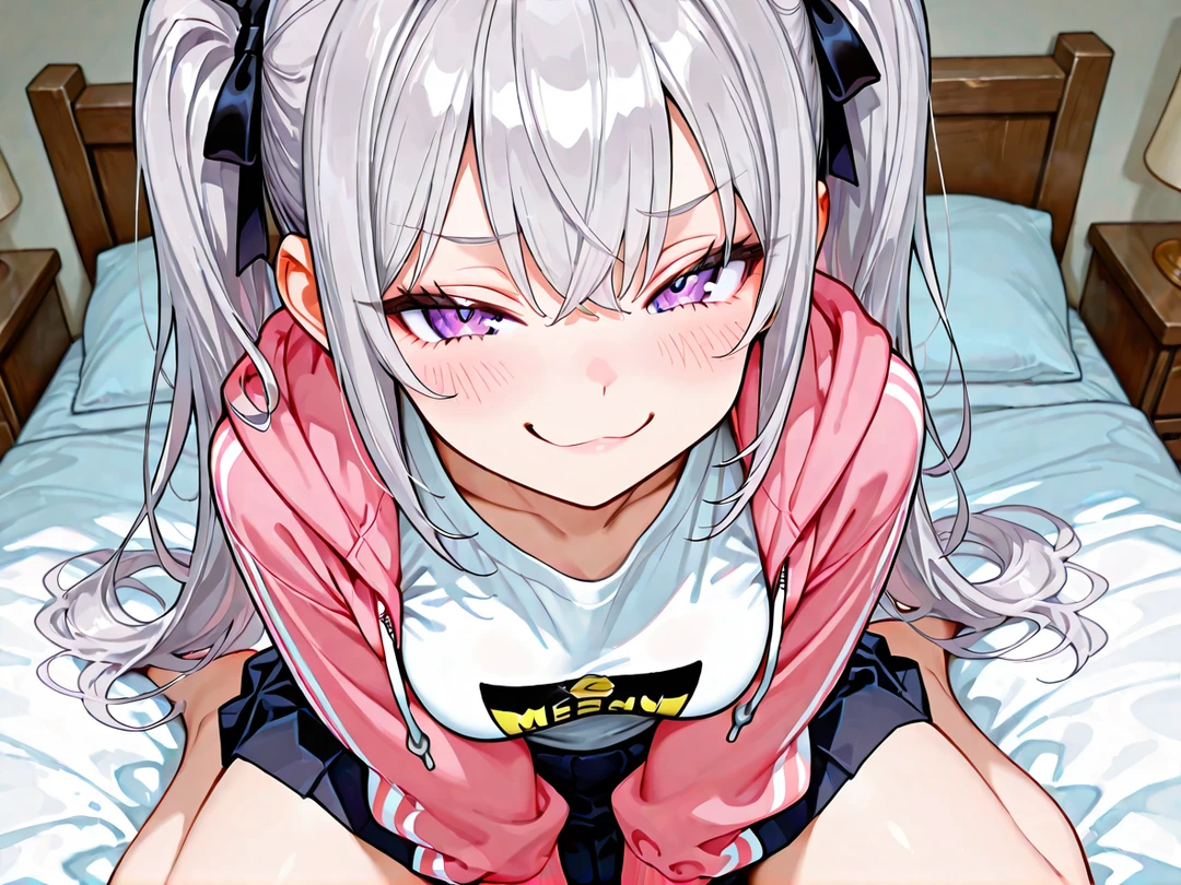 소하는 기다렸다는 듯 입꼬리를 살짝 올리며 혀를 내밀어 보인다. 보랏빛 눈동자에는 장난기가 가득 서려 있고, 트윈테일로 묶은 은발이 침대 위에서 살랑거린다.