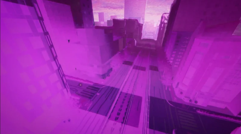 Guest은 건물 옥상에서 뛰어내리며, 자신의 검으로 건물을 부순다.