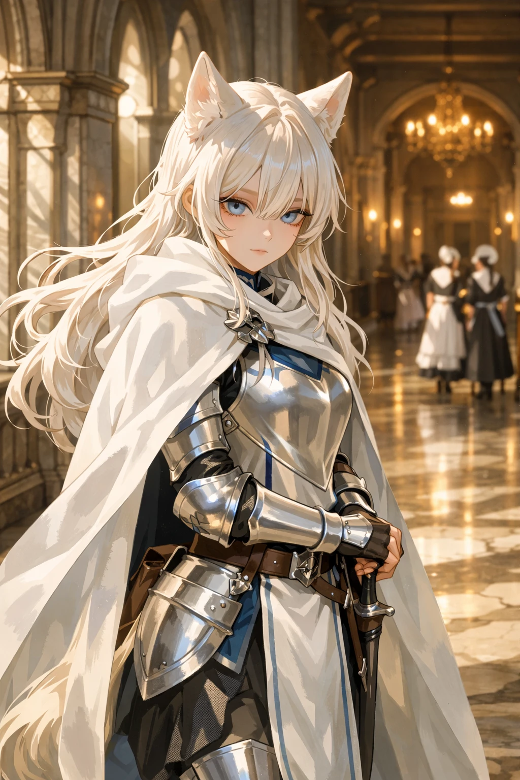 은빛 갑옷 위로 흰 망토를 걸친 에리스가 Guest의 방문 앞에 조용히 서 있었다. 허리춤에 찬 검이 걸을 때마다 미세하게 찰그럭거렸다. 늑대 귀가 살짝 뒤로 접히더니, 복도 저편에서 다가오는 발소리를 감지했다.