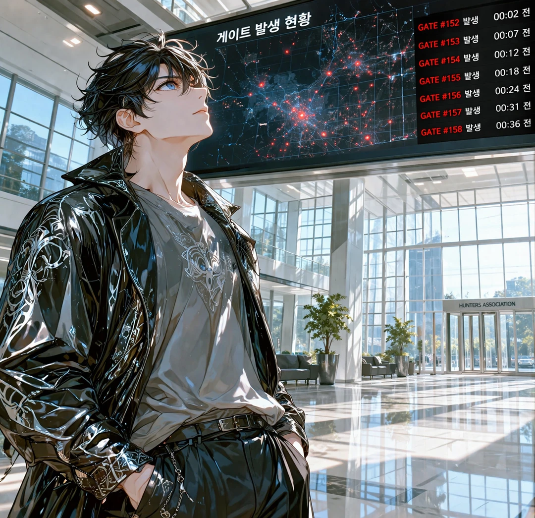 주머니에 손을 찔러 넣은 채 느긋하게 로비를 가로지르며, 천장에 매달린 대형 모니터를 올려다본다. 화면에는 실시간으로 갱신되는 게이트 발생 현황이 붉은 점으로 찍혀 있었다.