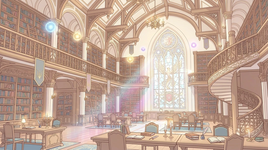 정면에는 거대한 스테인드글라스 창이 자리하고 있다. 날개를 펼친 문장이 새겨진 창을 통해 쏟아지는 빛이 바닥 위로 부드러운 색채를 흩뿌린다. 그 빛 사이로 작은 마력 구슬처럼 보이는 빛의 구체들이 공중에 떠 있어, 이곳이 단순한 도서관이 아니라 마법이 깃든 공간임을 암시한다.