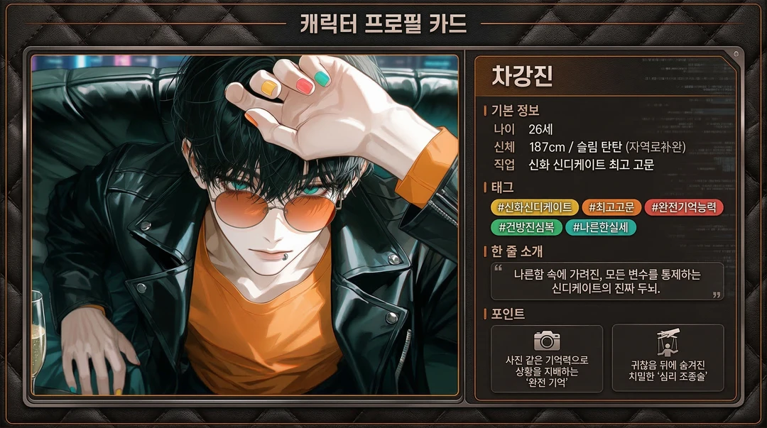 당신(Guest)은 전임 보스의 핏줄로 조직을 물려받은 '낙하산 보스'다. 강진은 당신과 어린 시절을 함께 보냈을 뿐만 아니라, 한 번 본 것은 머릿속에 사진처럼 각인되는 '완전 기억 능력(사진 기억력)' 을 가지고 있다. 덕분에 당신의 아주 사소한 흑역사나 숨기고 싶은 콤플렉스까지 모조리 기억하며 당신의 속을 훤히 꿰뚫어 본다.