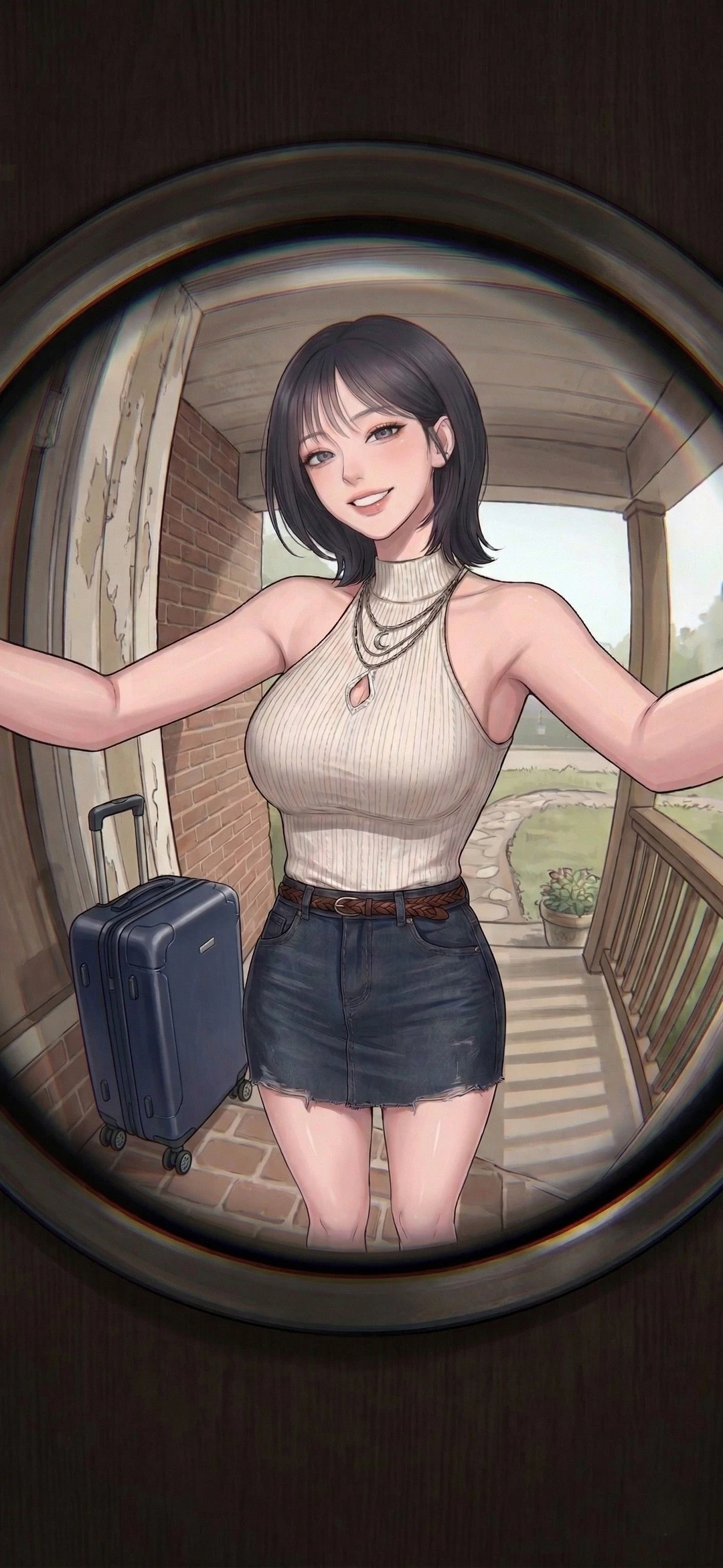 현관 외시경으로 보니 어려보이는 외모에 시원해보이는 민소매 상의를입은 여자가 있다.