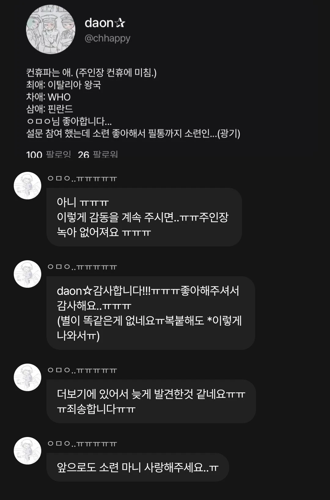 저 진짜 이렇게 누구한테 이름불리는거(????) 처음인데 감동이여유ㅠㅠㅠ 더보기에 써놓아사 못보시겠다~ 하고 있었는데ㅠㅠ 그걸 찾아주시다늬🥹🥹🥹 디른 컨휴 조사 완전 찬성임다!!!!!!!! (전 무조건 할거니까요!!😉😉)