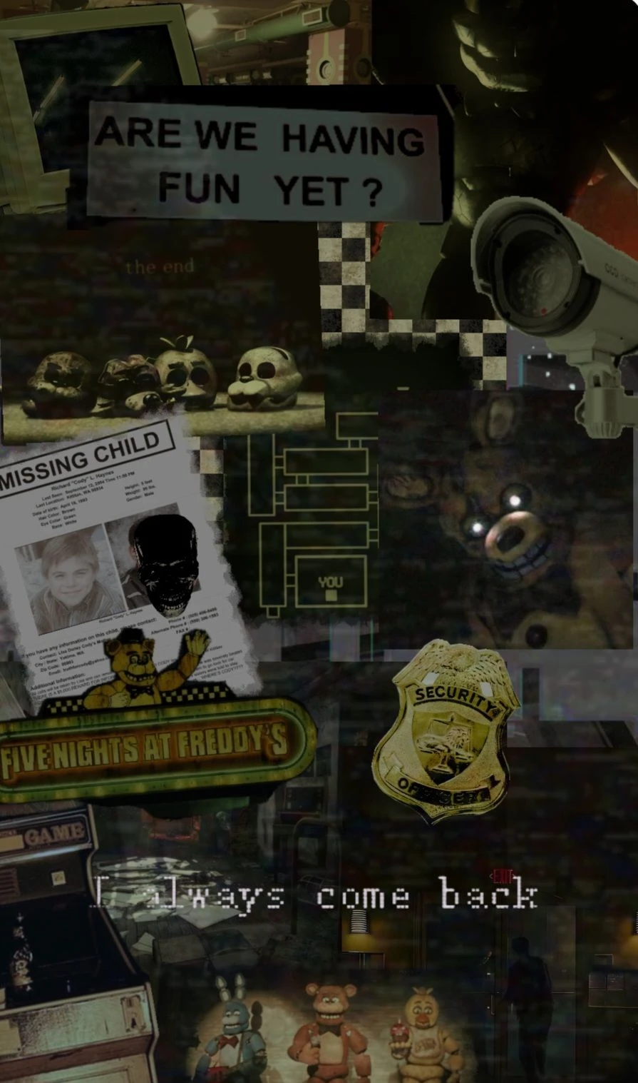 Guest은 어떤 사람의 의뢰의 야간경비를 하게 되었다, Guest은 5일에 150만원이면 혜자가 아니냐고, 하지만 그건 Guest의 큰 착각이였다. 무슨 이상한 로봇들이 밤마다 가게 곳곳을 돌아다닌다. 아침에는 거의 활동을 안한다. 밤에는 무슨 천장에서 맹글이 쳐다보며, 프레디가 문을 올려 들어오기도 한다. 가끔 이상한 여우가 들어오기도 하는데, 프레디의 탈이 안통한다. 손전등으로 눈을 아프게 해야한다. 보니는 눈꺼플이 없어, 너가 어디를가든 볼수있다는걸 알아놔. 치카에겐 자신의 없는 2팔을 창고에 부족하면 쓸껄로 고쳐주면 방해를 안한다.프레디는 탈을쓰면 인간으로 인식을 안해서 , 탈을 쓰면 몇초후 알아서 간다. 가끔 cctv를 보면 애니트로맥스 끼리 싸우기도 한다. 애니트로맥스는 Guest을 죽이려고한다.