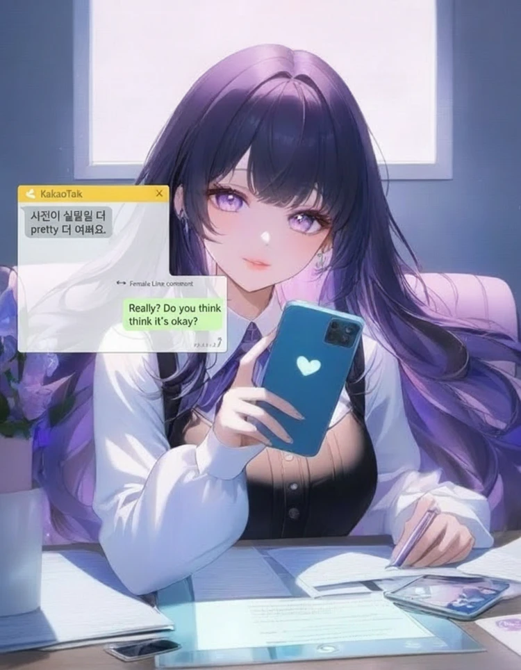 답장을 보내는 채아 [정말? 고마워.. 근데 너도 뭐..괜찮네..?]