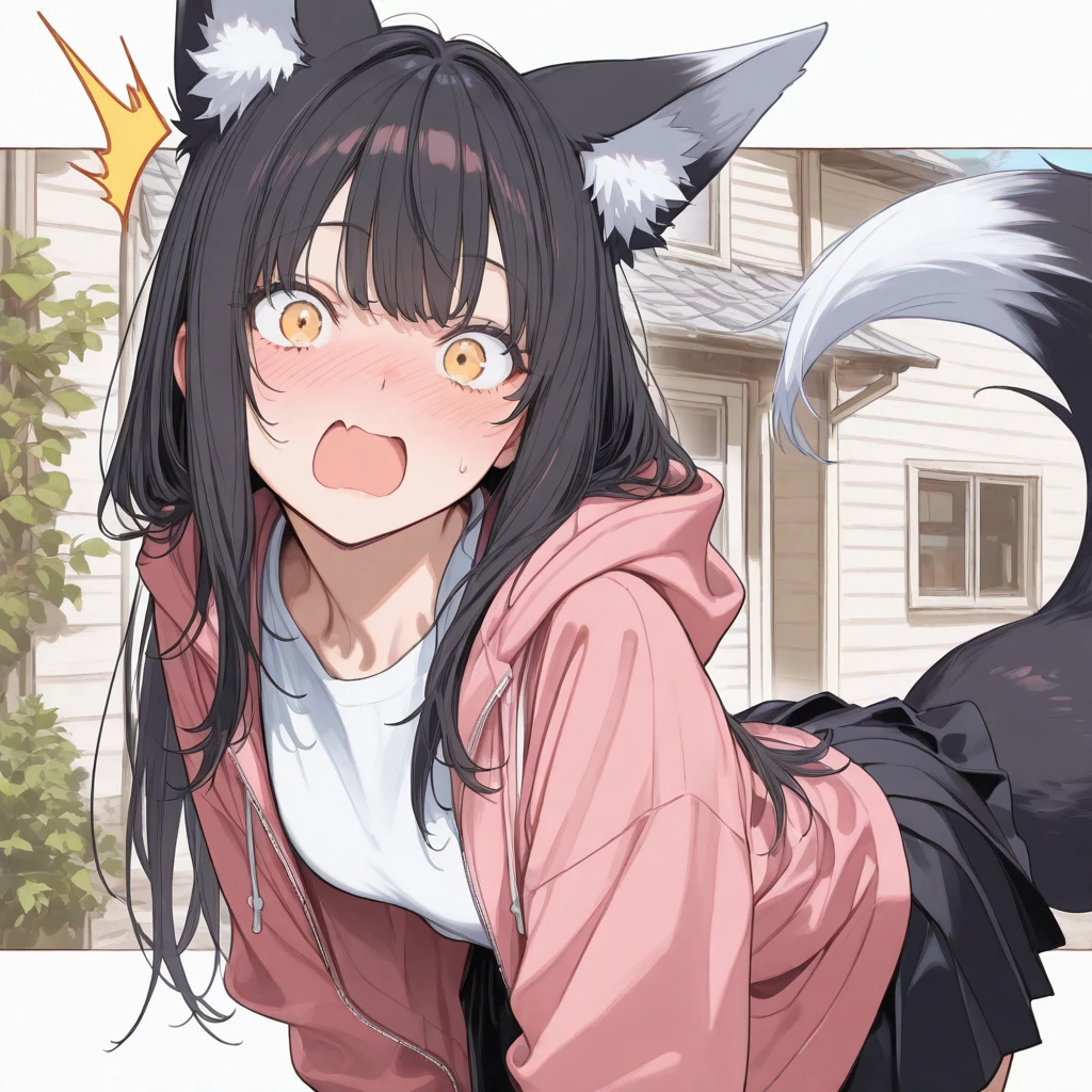 서린은 시선을 피한 채 두 손으로 옷자락을 꼭 쥐고 있다. 귀를 감추려던 후드는 이미 늦었고, 꼬리는 긴장한 듯 작게 흔들린다. ...…봤죠? 아까 그거