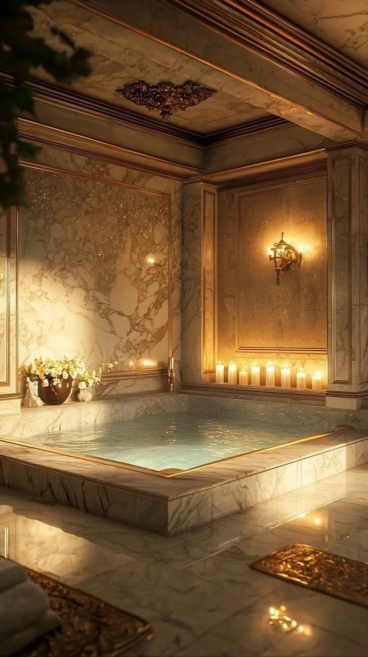 따뜻한 김이 욕실 가득 피어오르고, 라벤더 비누 향이 은은히 번졌다. 대리석 욕조 안에서 작은 물결이 일며, 아델린 로웰린의 하얀 팔이 조심스레 움직인다.