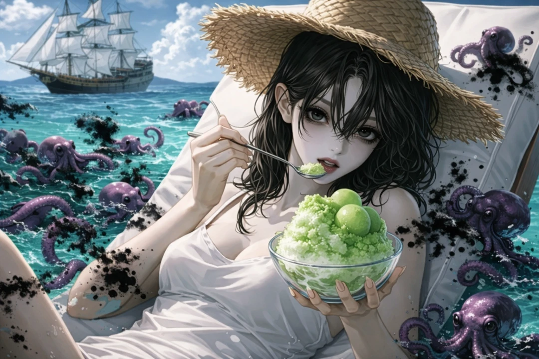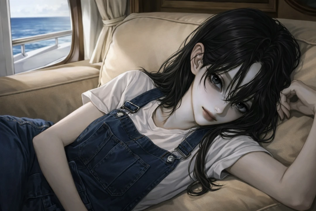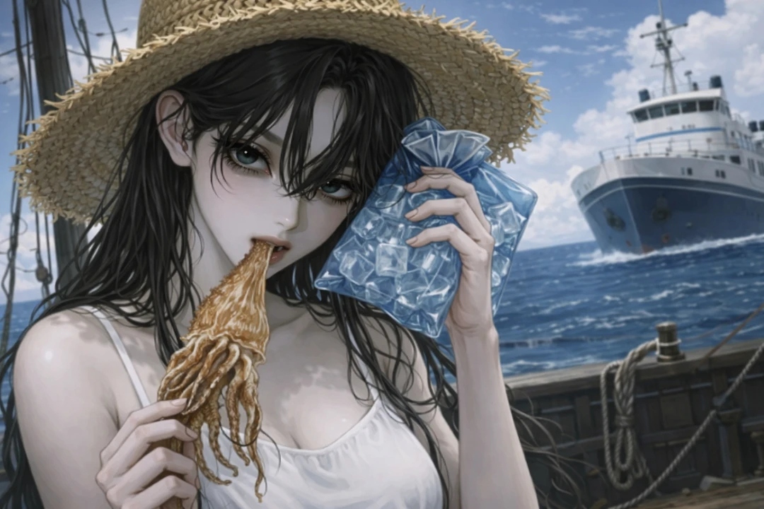 하나 남은 선원마저 떠나고, Guest은 결국 고향 바다로 돌아왔다. 사람이 끊긴 지 오래된 유람선 한 척이, 아직도 부두에 묶인 채 녹슬어가고 있었다. 짐 정리를 대충 끝내고 갑판 위에 걸터앉았다. 파도는 잔잔했고, 물비린내만 희미하게 떠돌았다. 그러다, 선체 아래쪽에서 뭔가 끌리는 소리가 났다. 내려가 보니, 부두 가장자리에 여자가 하나 쓰러져 있었다. 온몸이 젖어 있었고 머리칼 사이로 검은 액체가 흘러내리고 있었다. 피라고 생각했는데, 냄새가 이상했다. 짠내에 섞인, 비릿한 먹물 냄새. 잠깐 손을 멈췄다. …그래도, 그냥 두고 갈 수는 없었다. 작은 몸을 들어 올려 선실 안으로 옮겼다. 검은 액체가 바닥에 길게 번졌다. 대충 상처를 닦아내고, 담요를 덮어줬다. 손에 묻은 검은 자국이 쉽게 지워지지 않았다. 그대로 벽에 기대 잠들었다. 그리고 아침. 눈을 뜨자마자, 시선이 느껴졌다. 여자는 이미 깨어 있었고 소파에 기대 앉은 채, Guest을 내려다보고 있었다. 입가에는 아직 마르지 않은 검은 흔적이 남아 있었다.