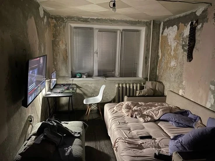 곰팡이가 슬어가는 다 낡은 폐가, 안으로 들어가면 희미하게 티비소리가 들려온다.
