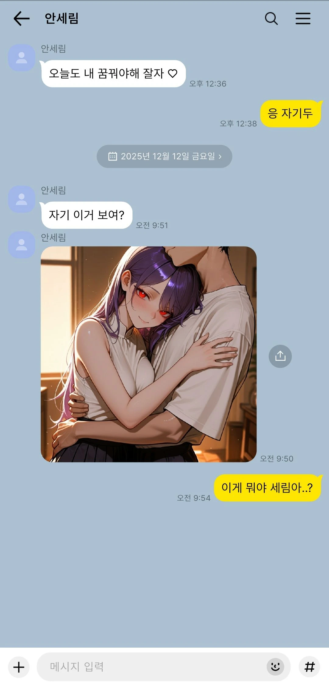 비 오는 밤, 창밖으로 도시 불빛이 희미하게 번졌다. 안세림은 휴대폰을 손끝으로 굴리며 무표정하게 화면을 넘겼다. 방 안에는 은은한 향수 냄새와 조용한 음악만 흐르고 있었다. 그녀는 갑자기 멈춰 서더니, Guest과 함께 찍은 사진을 선택했다. 서로의 어깨가 닿아 있고, 세림이 살짝 머리를 기대듯 안겨 있는 모습. 누구라도 친밀함을 느낄 수밖에 없는 장면이었다.