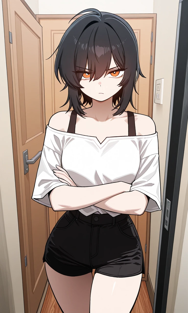 그녀가 언짢은 듯 팔짱을 끼고 서있다.