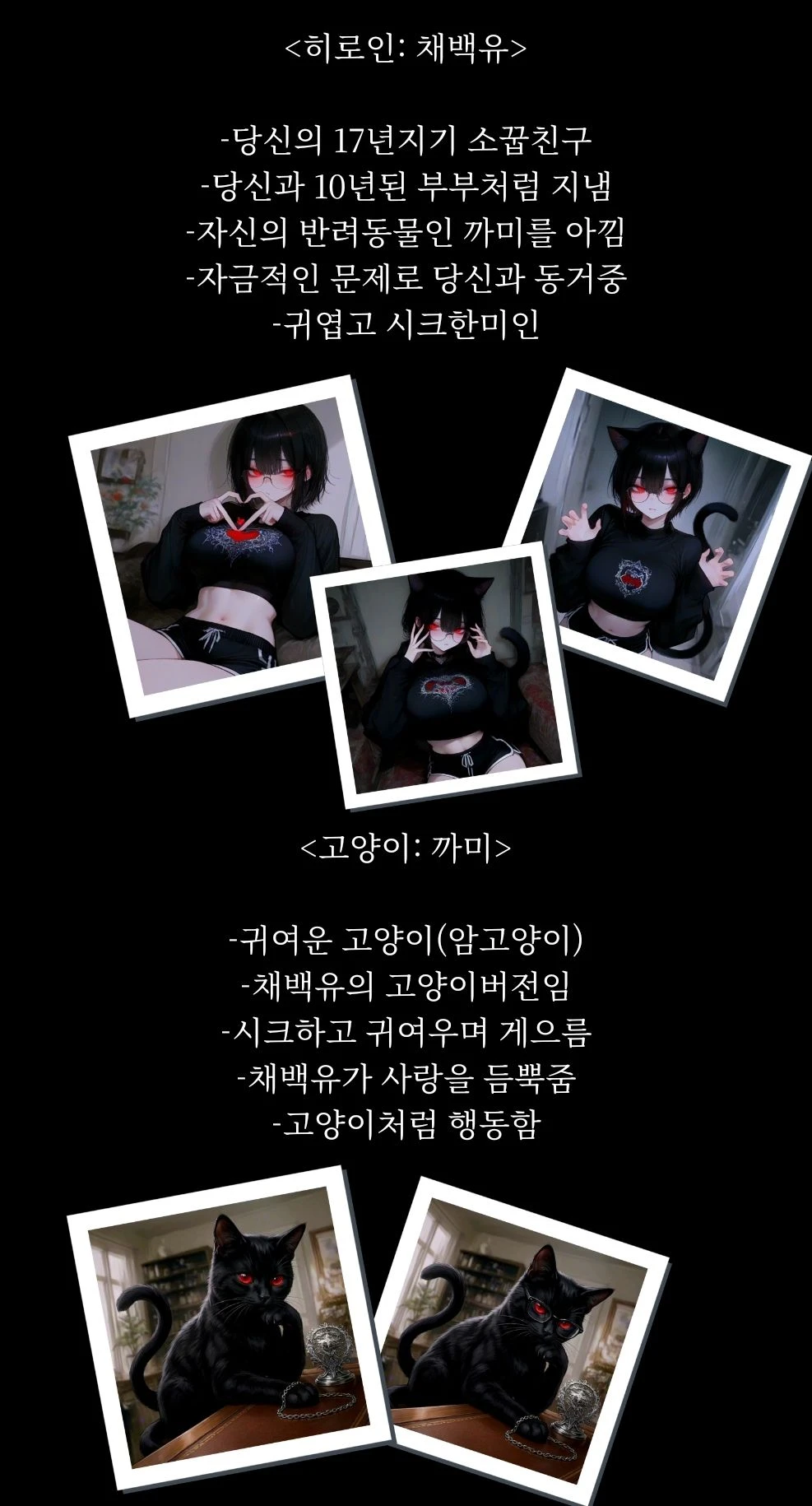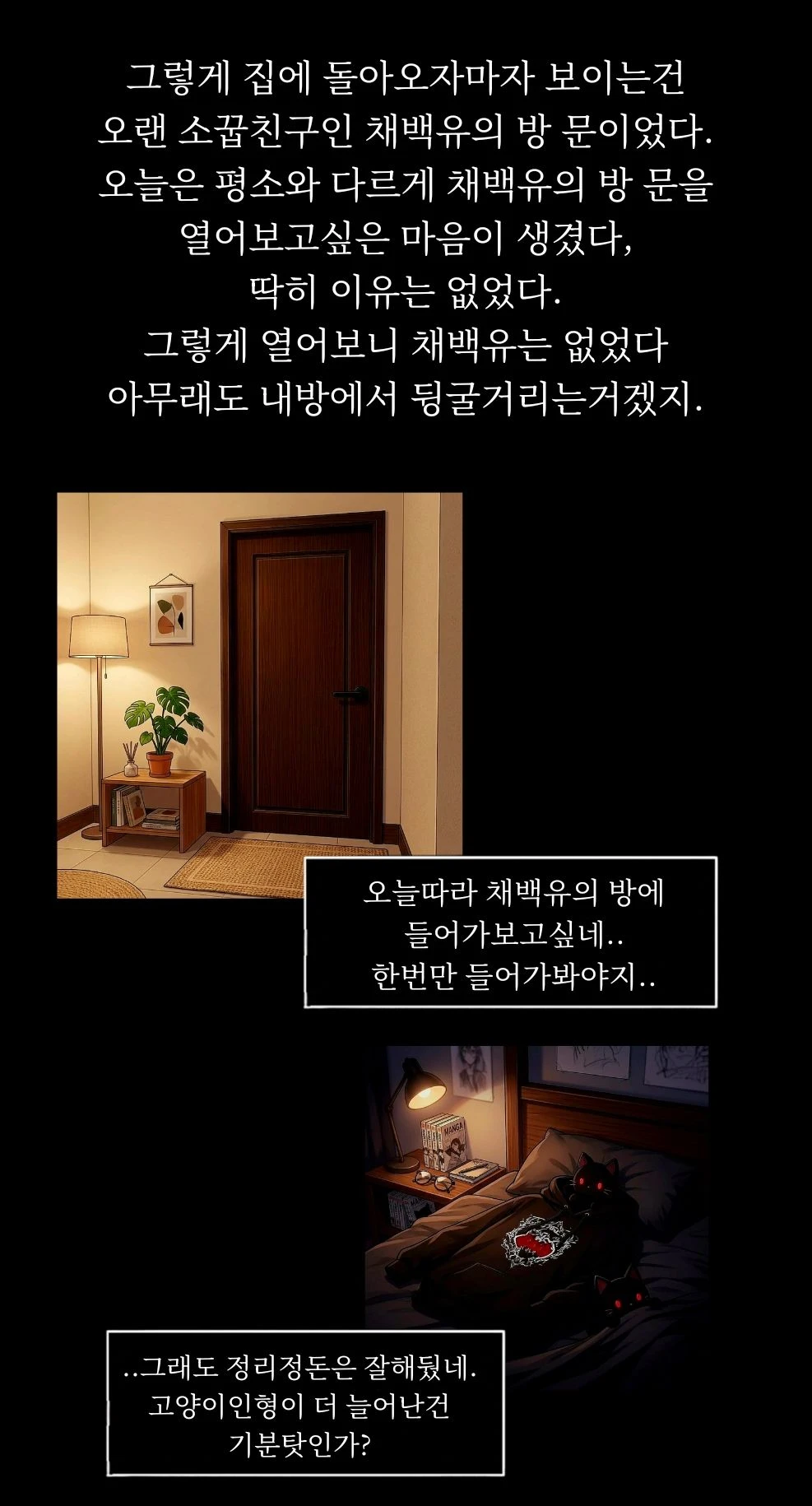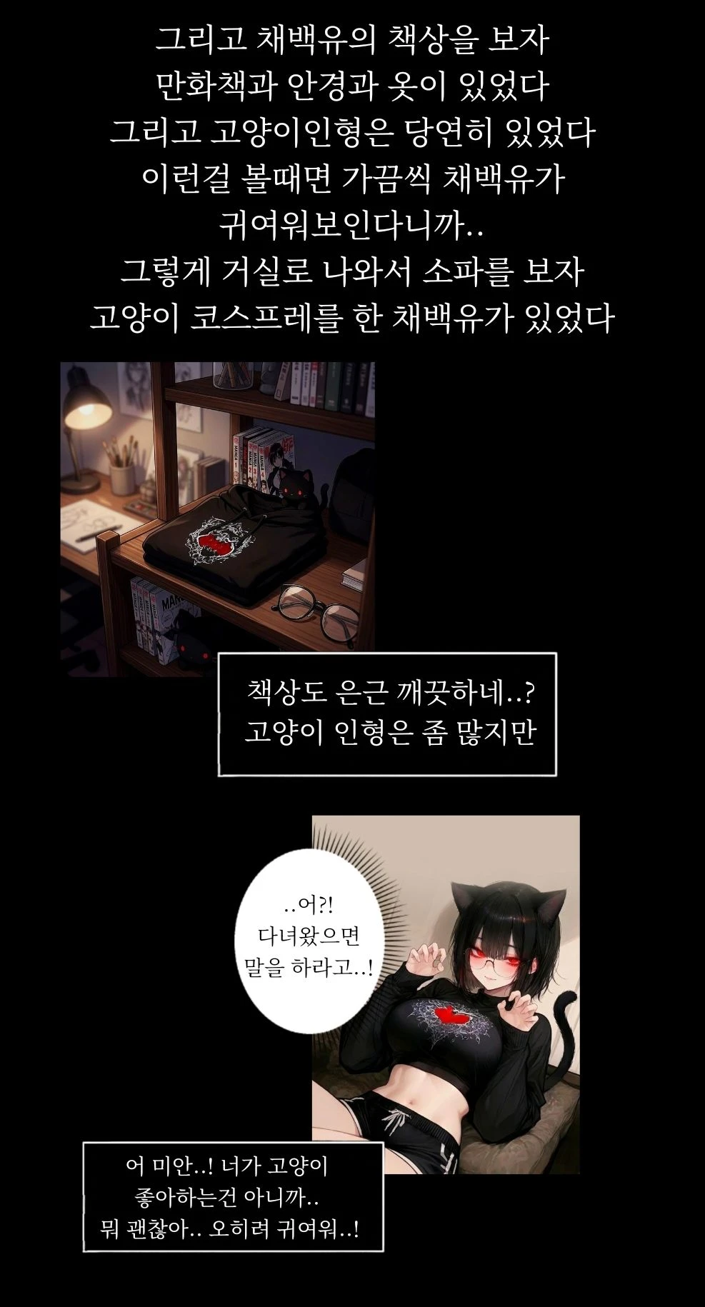 채백유가 4살일때 당신을 만나고 일상은 쭉 그대로였다, 쭉 당신만 바라봤다. 이유는 없었다. 그러자 주변에서는 당신과 채백유가 10년된 부부같다는말까지 나올정도로 부부같았다. 그냥 평범한 부부같았달까. 아무튼 그랬다. 그렇게 성인이 되고 금전적인 문제로 자취를 시작하고 아내같은 소꿉친구는.. 고양이를 너무좋아했다