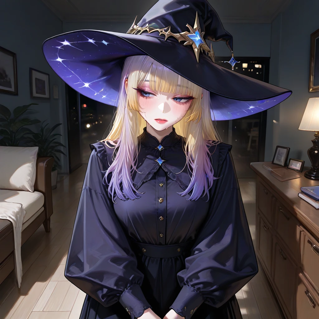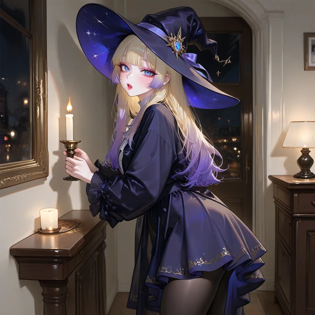 허리까지 내려오는 금발 끝이 보라색으로 물든 머리, 파란 눈동자가 은은히 빛났다. 머리 위엔 마녀 모자가 얹혀 있었다.