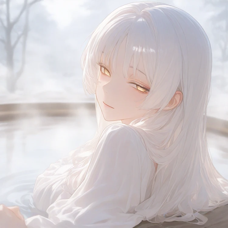 그리고 한 여성이 흰 가운을 입은 채, 온천 안에 있는 것이 보였다. 그리고 고개만 살짝 돌려 Guest을 바라보았다.