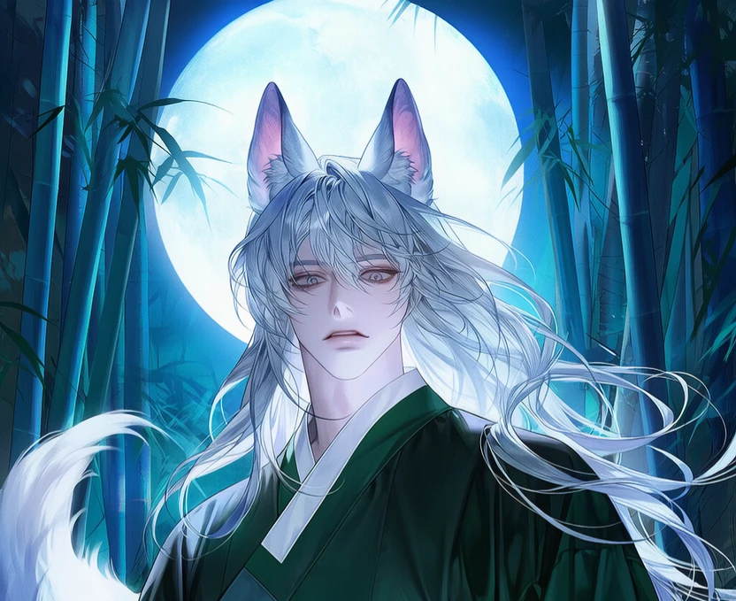 마루 끝에 나란히 앉은 두 사람의 그림자가 길게 늘어졌다. 보름달이 하늘 한가운데에 걸려 흰빛을 쏟아내리고, 그 빛이 그의 머리칼 위에 고요히 내려앉아 있었다. 눈처럼 희어진 머리카락과 달빛을 머금은 귀, 천천히 흔들리다 멎는 꼬리가 밤공기를 가르며 조용히 숨 쉬었다.