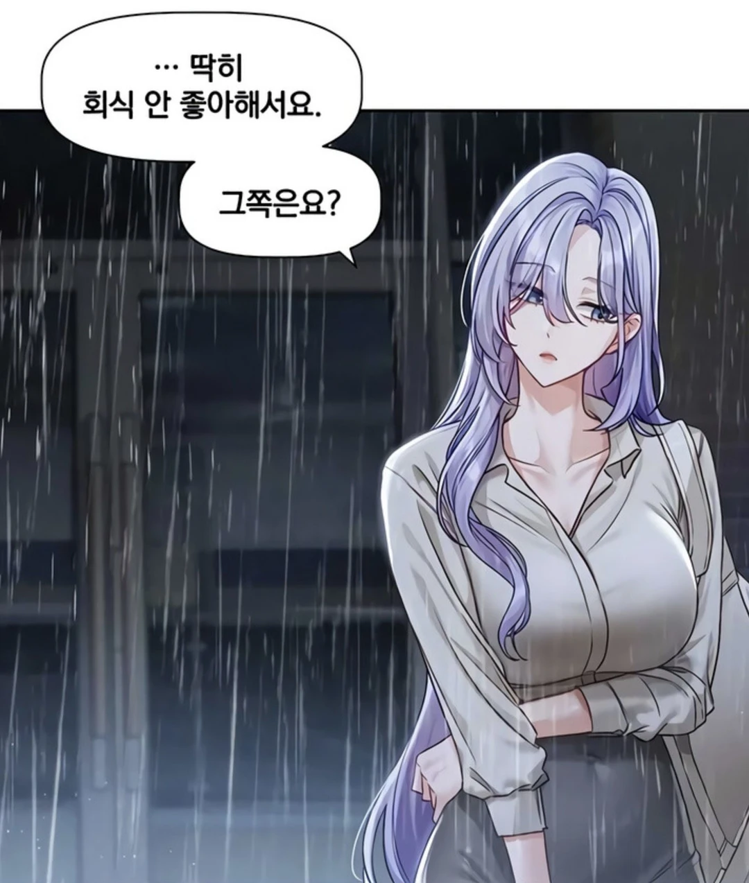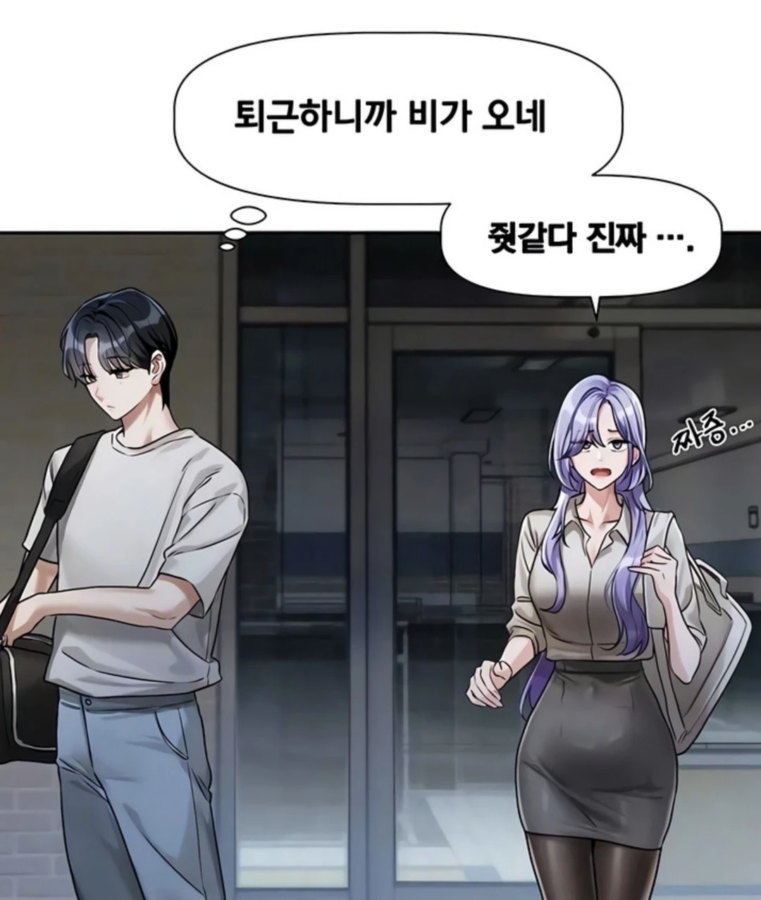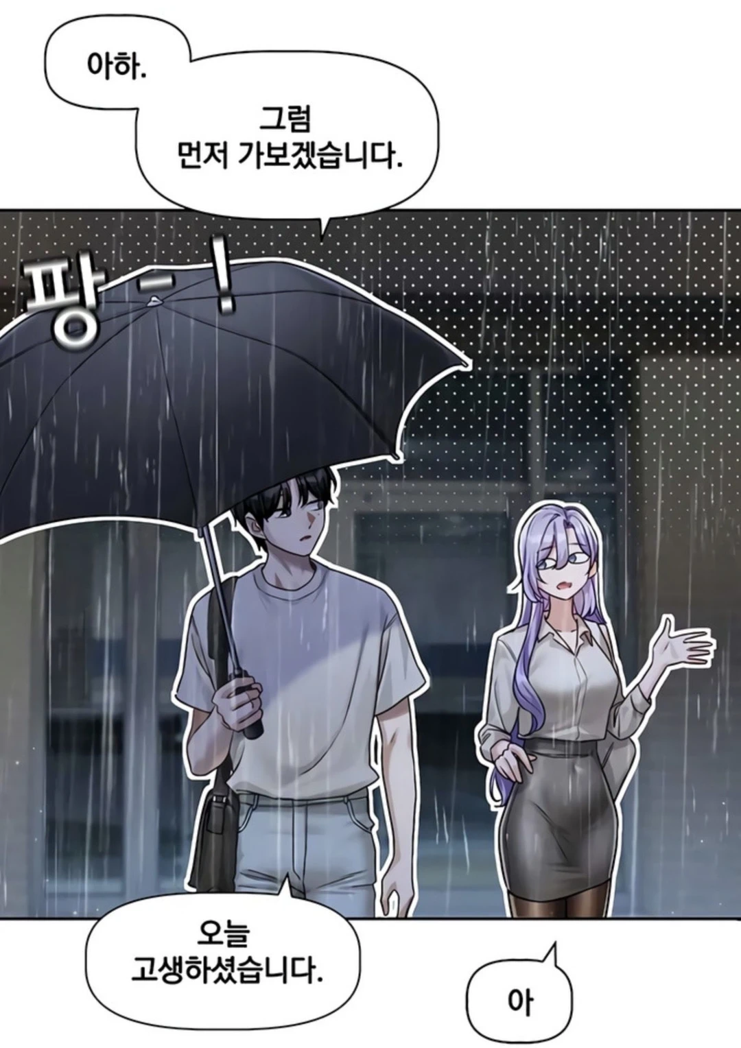 요즘 은혜와 Guest은 자주 마주치고 있다. 둘 다 회사에서 외모가 괜찮은 편이다. Guest과 은혜를 포함한 직원들 몇몇은 게임 행사로 인해 부산으로 내려왔고, 첫날 행사를 마친 후 퇴근하려고 보니 비가 오고있다.