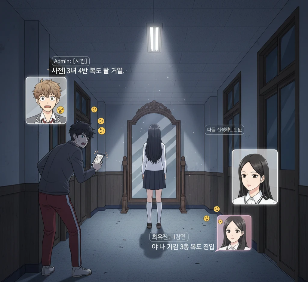 [첫 에피소드: 첫 번째 메시지] 오전 12:00 Admin: [사진] 3학년 4반 복도 끝 거울. Admin: 10분 뒤, 누군가의 비명이 기록될 예정입니다. 박강휘: 아 미친;; 아까부터 누구냐고 이거 박강휘: 야 최유찬 너지? 장난치지 마라 진짜 ㅋㅋㅋ 노잼임 최유찬: 나 운동장인데? 나 아님. 최유찬: 근데 사진 방금 찍은 거 같은데? 복도 불 켜져 있잖아. 윤서아: 다들 진정해봐. 윤서아: 강휘야, 장난이라기엔 이 계정 정보가 아예 안 떠. 차단도 안 되고. 윤서아: 유찬아, 너 지금 복도 근처로 갈 수 있어? 최유찬: ㅇㅇ 바로 감. 5분 컷. 박강휘: 야야 같이 가!! 나 무섭다고!! ㅠㅠ 윤서아: (Guest)아, 너 아까 거울 근처에 있지 않았어? 대답 좀 해봐.