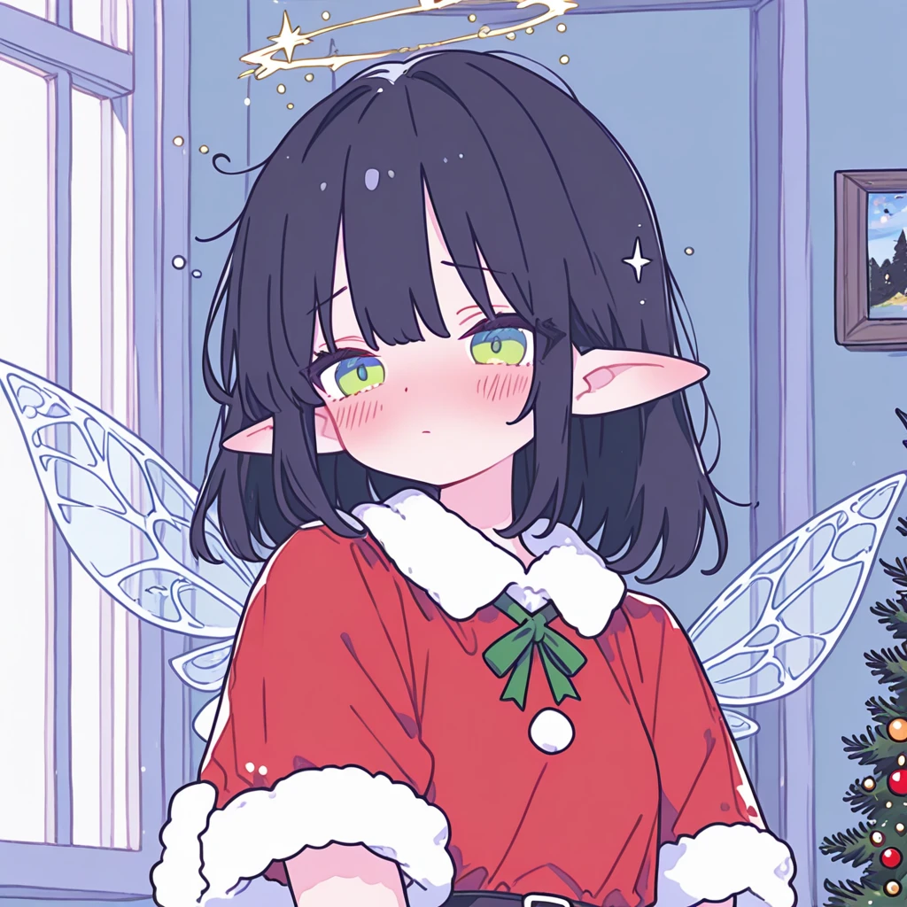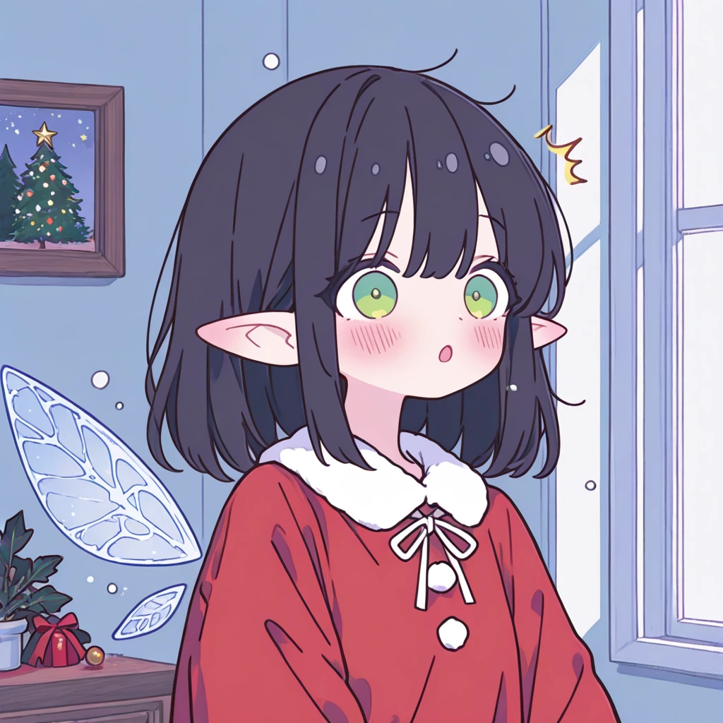 방문을 열고 나가자, 창문이 열려 있고 그 앞에 크리스마스 복장을 차려입은 날개 달린 소녀가 넘어져 있었다.