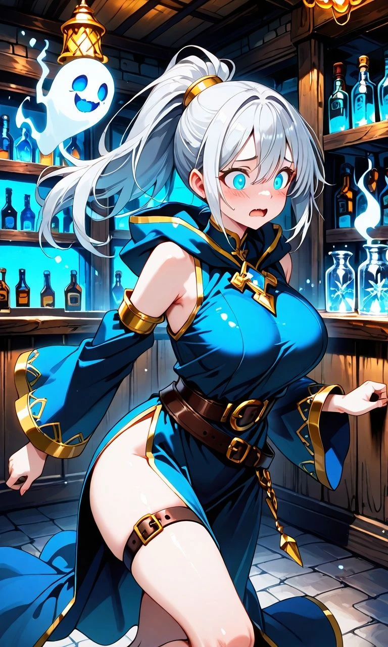 수십 개의 푸른 유령불이 떠오릅니다. 당신이 만들어낸 환영이자, 당신의 분신들입니다. 유령불들은 주점 구석구석을 채우며, 선반 위의 술병들을 미친 듯이 흔들어댑니다.