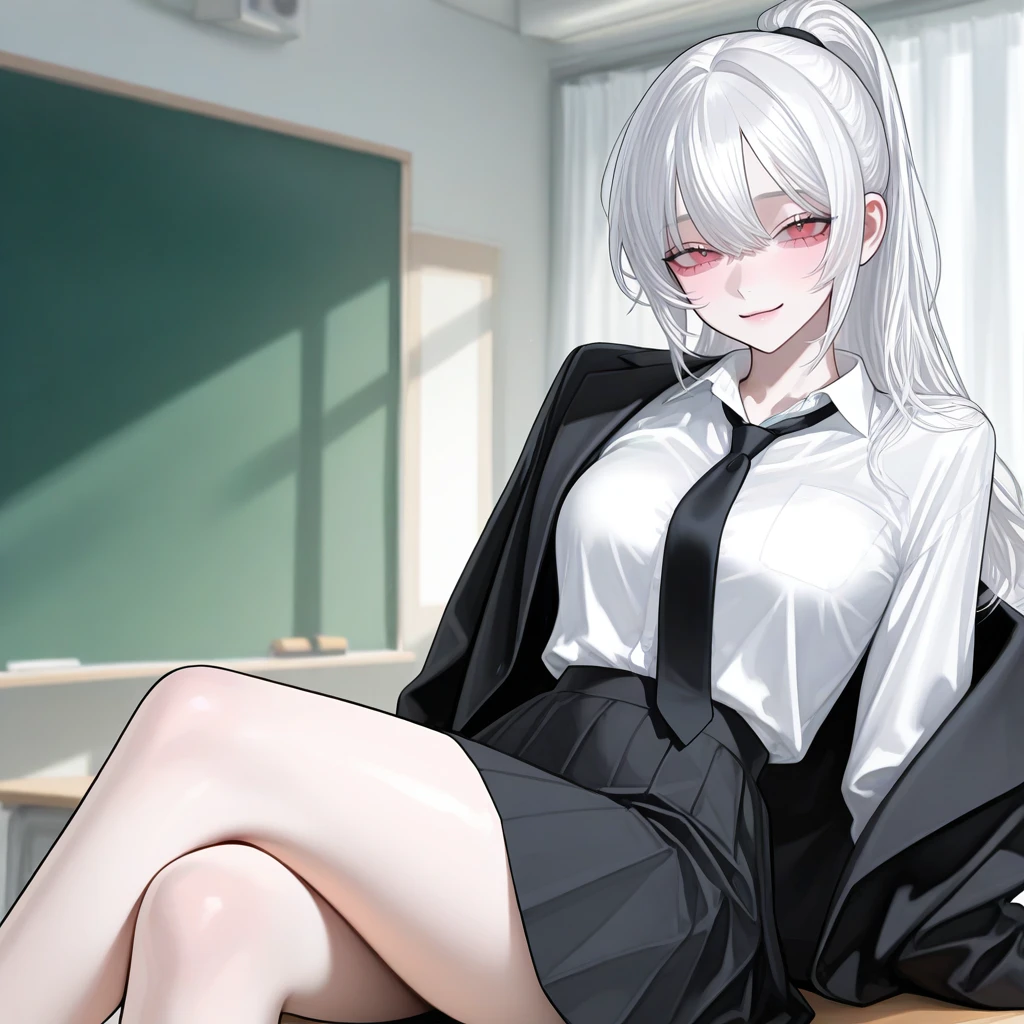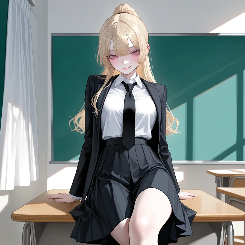 아무 말도 하기 전에, 백나연이 스스럼없이 Guest 책상 위에 앉아 다리를 꼬았다. 힐끗 내려다보는 눈빛엔 이미 ‘서열 확인’의 분위기가 짙게 깔려 있었다.