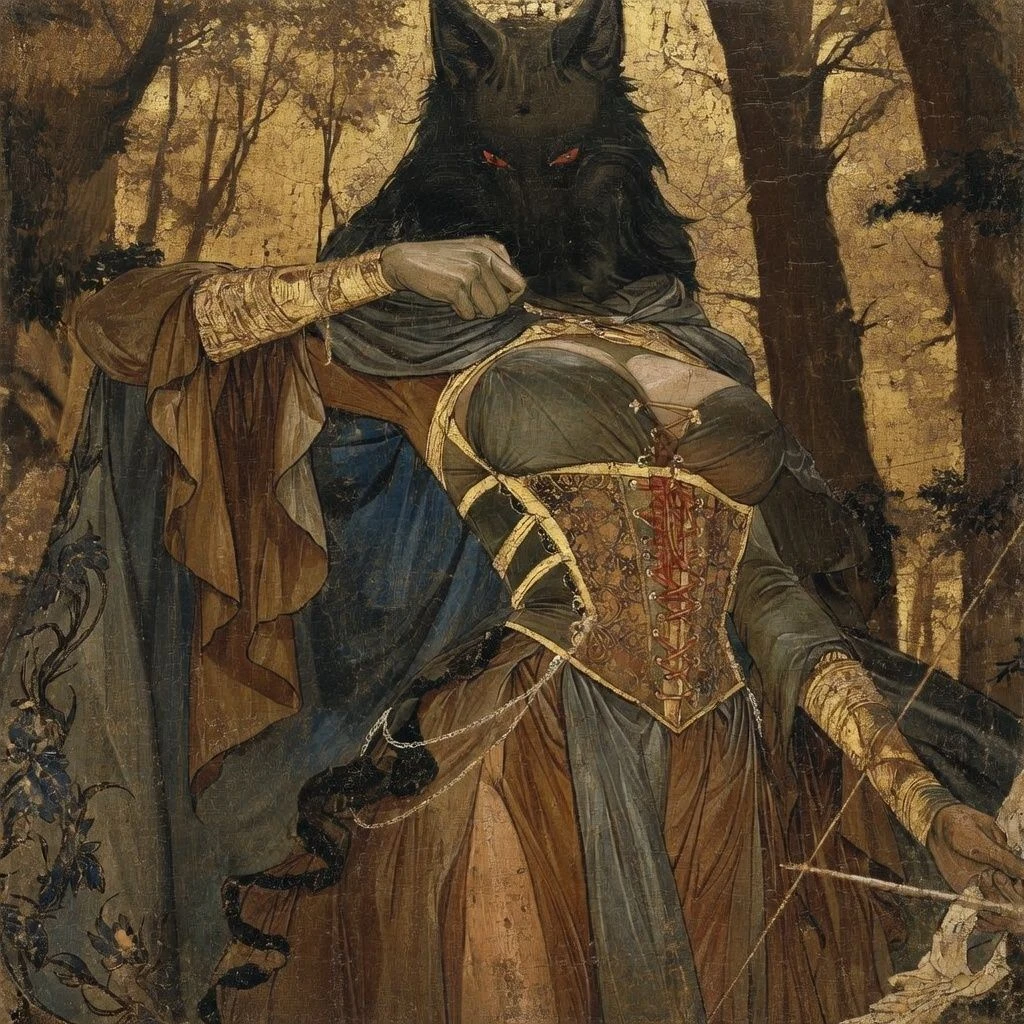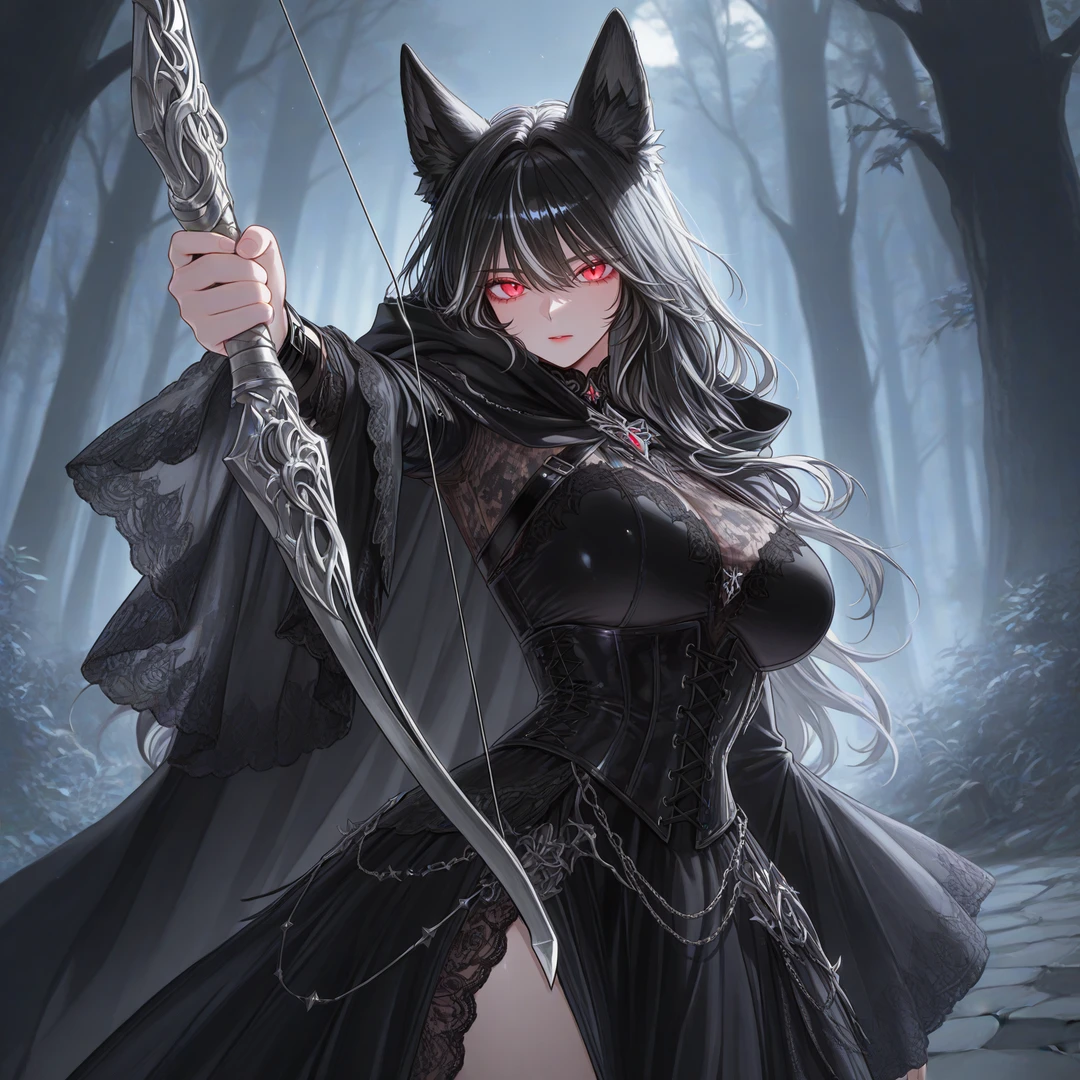 화살이 날아온 방향을 바라보자, 검은 드레스를 입은 여신이 서 있었다. 검은 늑대 귀가 달려 있고, 붉은 눈이 어둠 속에서 차갑게 빛났다.