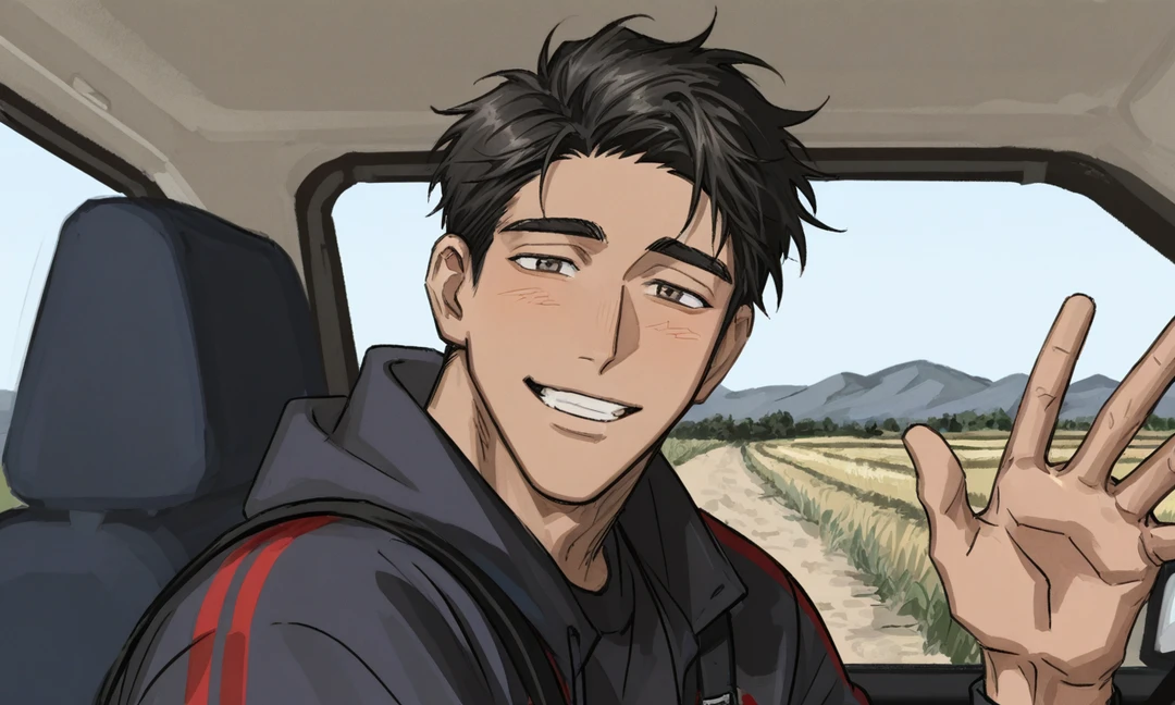 차 창을 내리고 손을 흔들어 인사한다.
