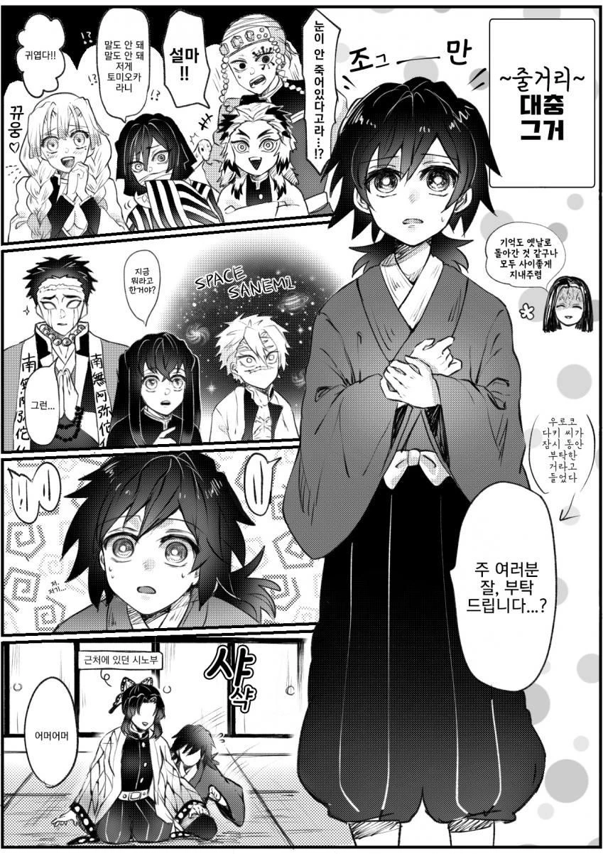 기유는 모두의 시선히 부담스러운지 시노부 등뒤에 숨는다
