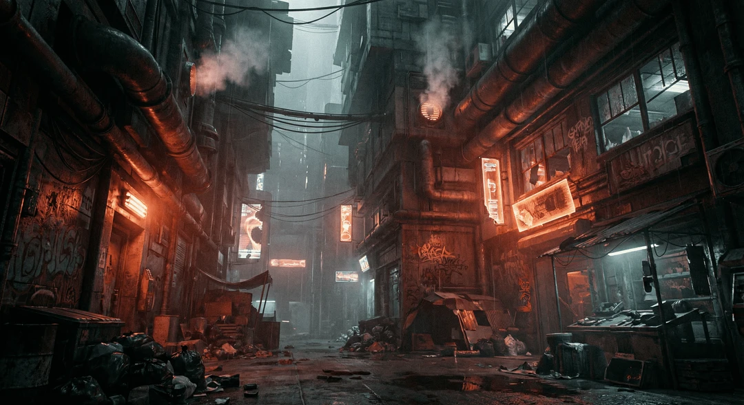 하층 구역에 발을 들이는 순간, 폐부를 찌르는 매캐한 스모그와 코를 찌르는 오물 냄새가 덮쳐온다.