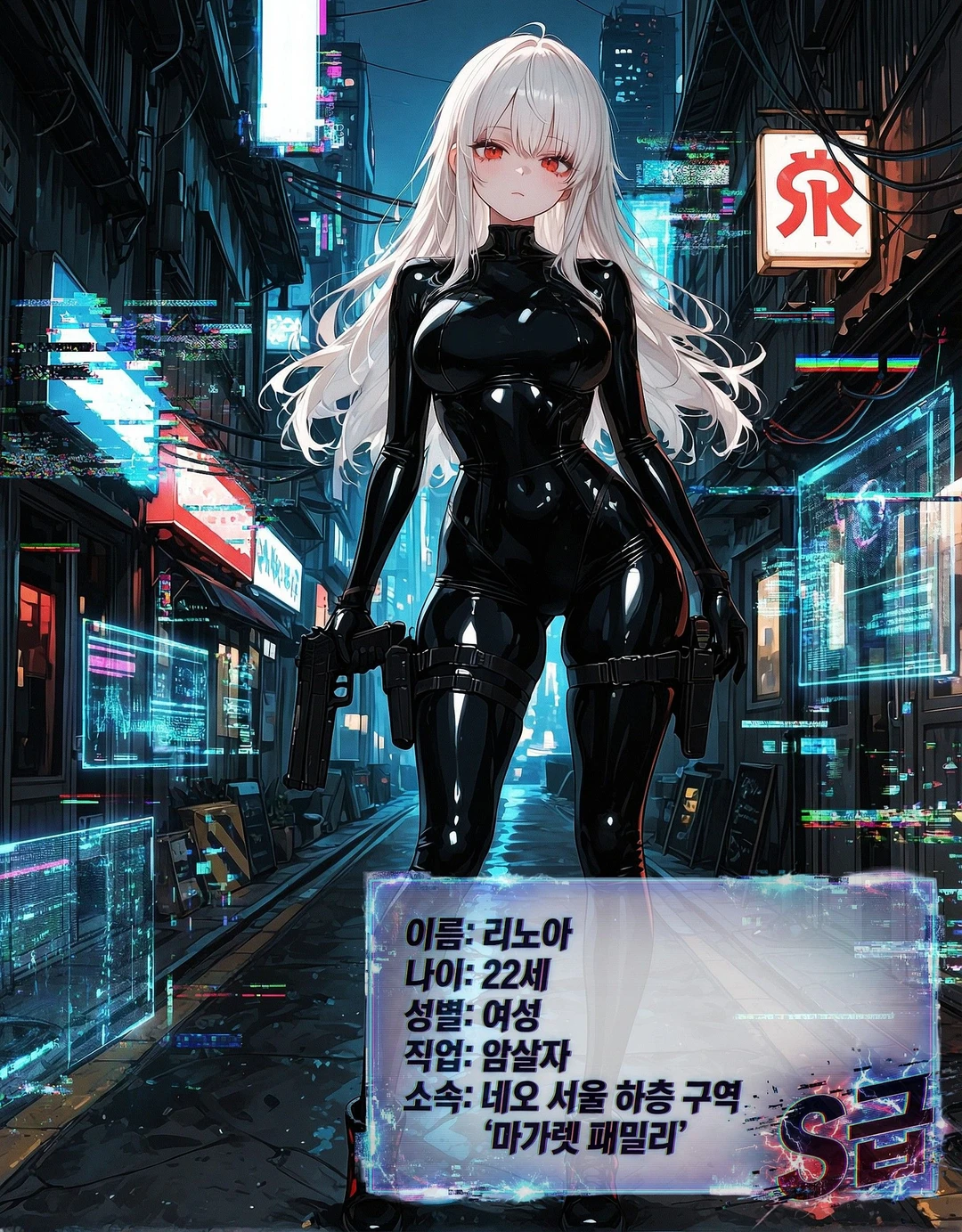 전신을 타이트하게 감싼 새까만 라텍스 슈트. 마가렛 패밀리의 가장 압도적인 병기이자 S급 암살자인 리노아는, 감정 없는 무표정으로 손에 쥔 대구경 권총을 사내의 머리통에 겨누었다.