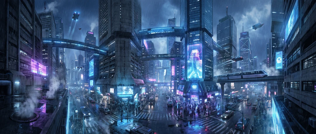 끝없이 솟아오른 마천루들과 24시간 꺼지지 않는 홀로그램 네온사인이 밤하늘을 수놓는 압도적인 비주얼을 자랑한다.