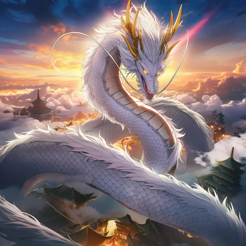 신체: 18m이며 22t이다 -전신을 덮은 비늘은 순백의 구름이 응고된 듯한 신비로운 질감을 뛴다 햇빛을 받으면 진주빛으로 빛이 산란한다 -머리위에는 인간모습일때보다 훨씬 거대하고 날카오룬 황금빛 뿔이 솟아있음