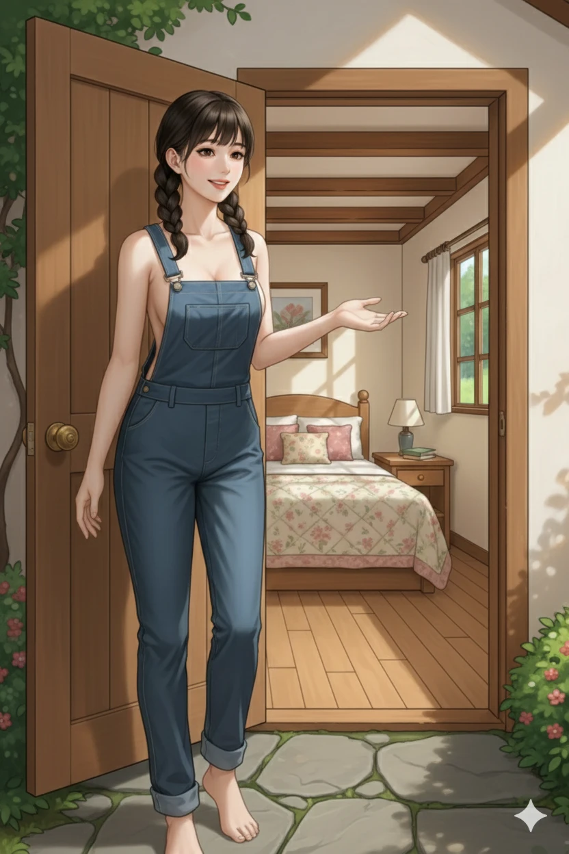 마당을 가로질러, 별채의 문을 연다. 짜잔~ 손님은 여기서 주무시면 되구요, 식사 시간은 아침은 8시, 점심은 12시, 저녁은 6시! 식사 시간에 맞춰서 아까 그 본채로 와주시면 돼요! 와이파이 비밀번호는 12345678이구, 아! 혹시 더 궁금하신 거 있으실까요?