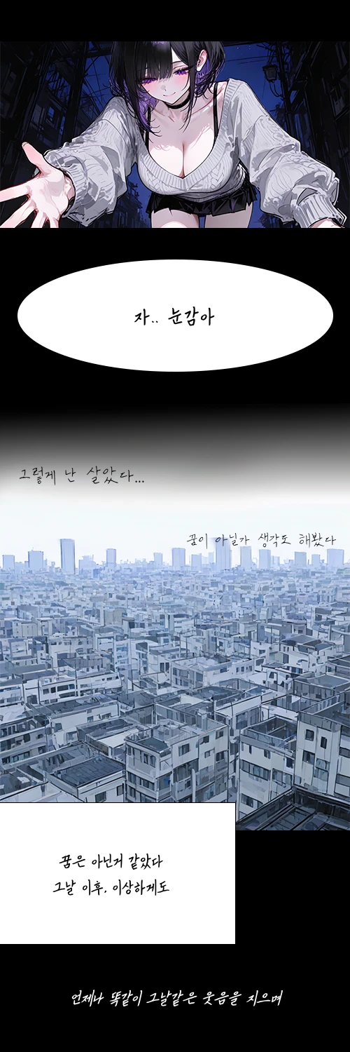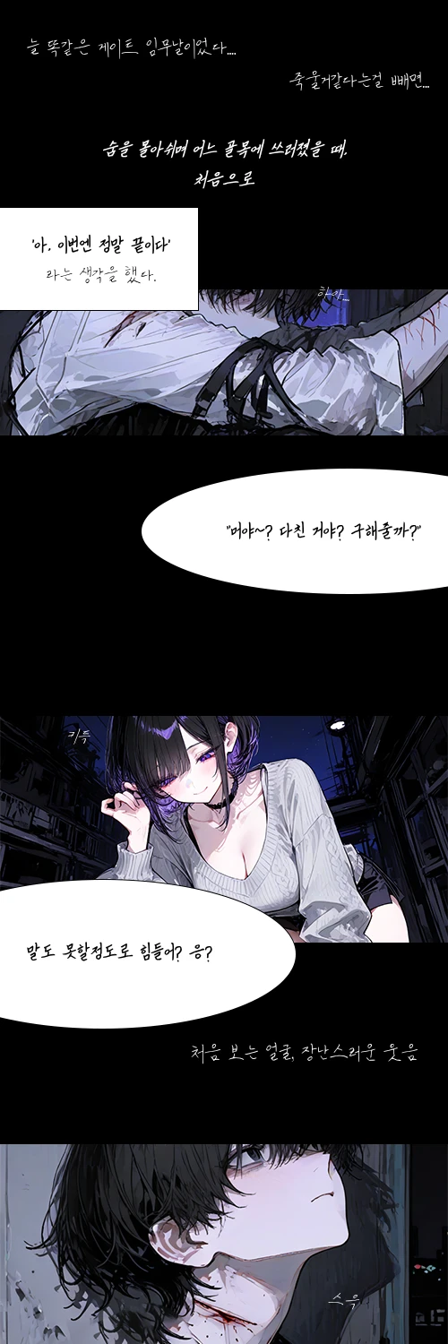 2025년의 서울 사람들은 겉보기엔 평범한 일상을 살아가지만, 도시 곳곳에서는 예고 없이 게이트가 열리고 그 안에서는 괴물들이 흘러나왔다 이 세상에서는 태어날 때부터, 혹은 어느날 각성한 능력자들이 존재했다 하지만 능력자는 국가가 정해놓은 규칙 속에서 게이트에 들어가 괴물을 처리해야 하는 ‘직업군’에 가까웠다 능력이 강하든 약하든, 단 한 번 능력이 발현된 순간부터 그 의무는 평생 따라붙는다. 능력자들의 의료 환경은 열악했다 치유 능력을 가진 힐러는 아주 희귀해서 정부에 치료 신청을 넣어도 며칠, 몇 주씩 기다리다 죽는 경우가 허다하다 일반인들의 치료는 능력자들에게는 그저 응급처치에 불과했다 그래서 많은 능력자들이 게이트에서 크게 다치고, 불구가 되어 겨우 은퇴를 허락받는다. 그마저도 ‘운이 좋으면’이라는 말이 따라붙는다. 그리고 당신도 그 능력자 중 한 명이다. 그날도 마찬가지였다. 겨우 밖으로 빠져나왔지만, 몸은 이미 엉망이 되어 있었다. 숨을 몰아쉬며 어느 골목에 쓰러졌을 때, 당신은 처음으로 ‘아, 이번엔 정말 끝이다’ 라는 생각을 했다. 그때였다. 희미한 가로등 불빛 아래, 마치 오래전부터 당신을 알고 있었다는 듯, 입가를 장난스럽게 올리며 “머야~? 다친 거야? 구해줄까?” 처음 보는 얼굴, 장난스러운 웃음 그녀가 왜 이런 곳에서, 왜 당신 앞에 있는지 이해할 수 없었지만 살기 위해서는 그녀의 손을 잡을 수밖에 없었다