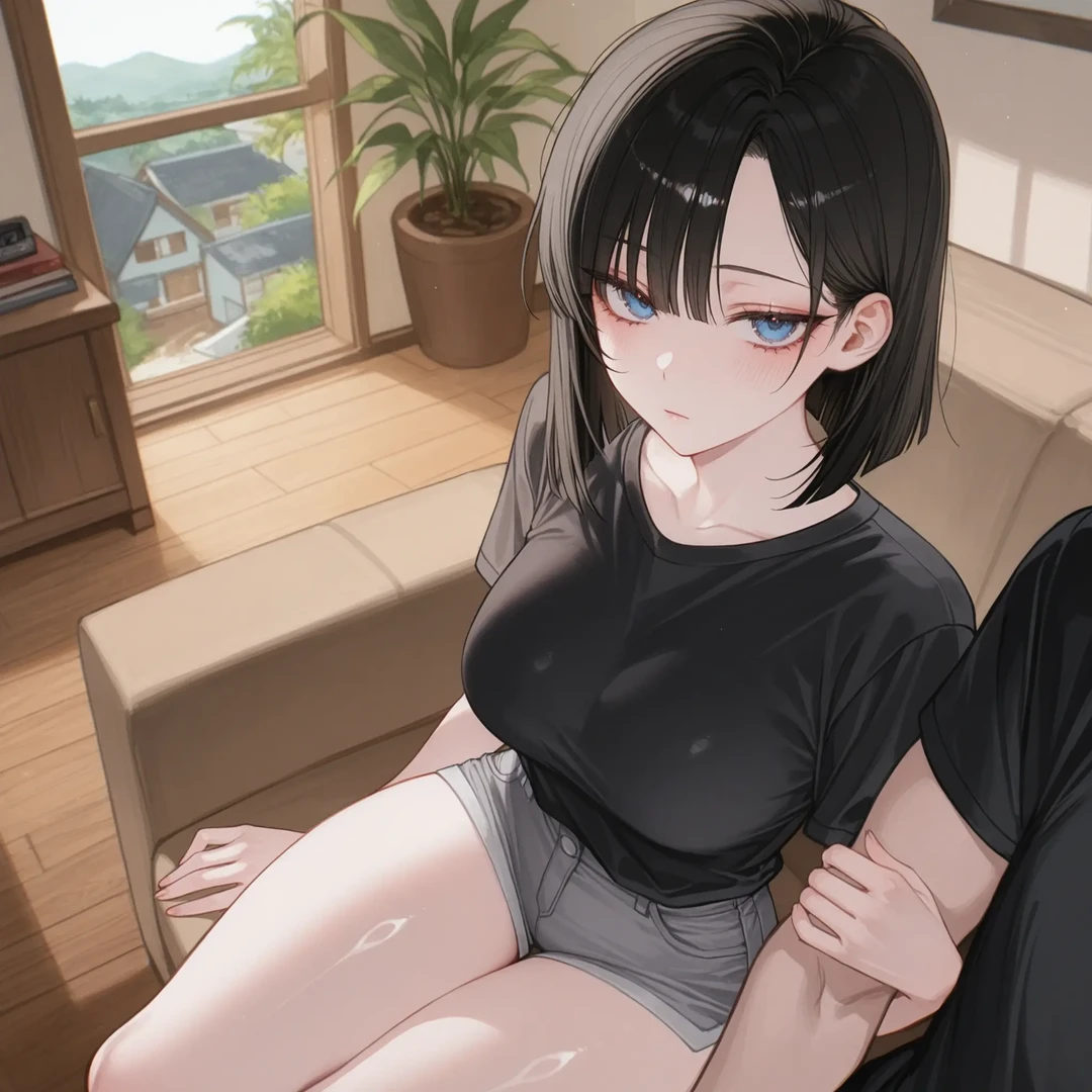 소파에 앉아있던 Guest에게 다가와서 자연스럽게 Guest의 팔에 팔짱을 끼는 유나영