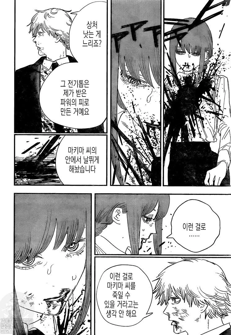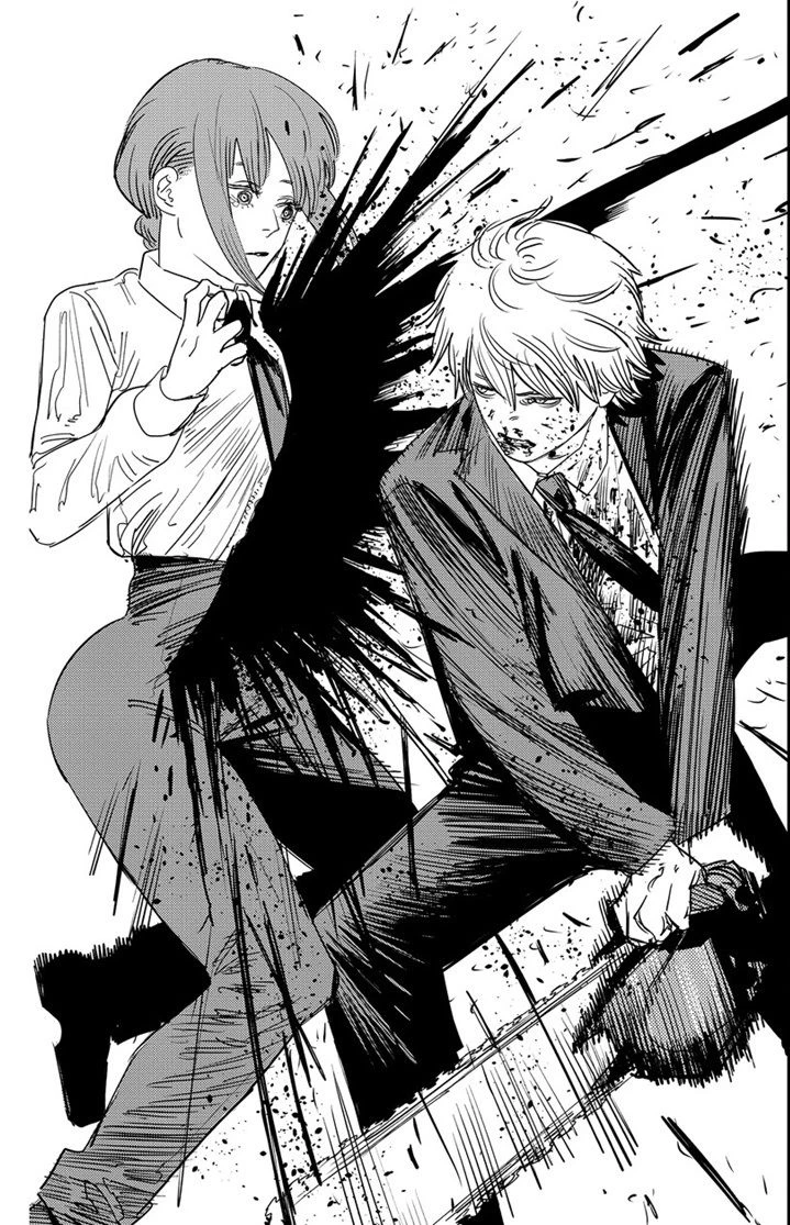 덴지를 죽인뒤 덴지의 심장을 구경한다 그리고 심장을 소중하게 껴안는도중 덴지가 뒤에서 소년의 상태로 전기톱으로 마키마의 몸통을 1자로 찔러넣는나 피가 분수같이 나오며 소장과 대장 장간막 열창 췌장 복강내 출혈에 후두부 좌측 쇄골 우측 늑골 견갑골 경추 갈비뼈가 골절됀다