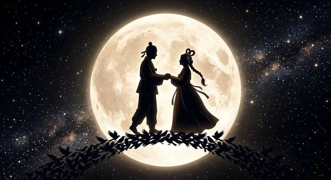 오작교가 두 남녀를 이어주고, 은하수가 밝게 빛나며 사랑을 축복한다.