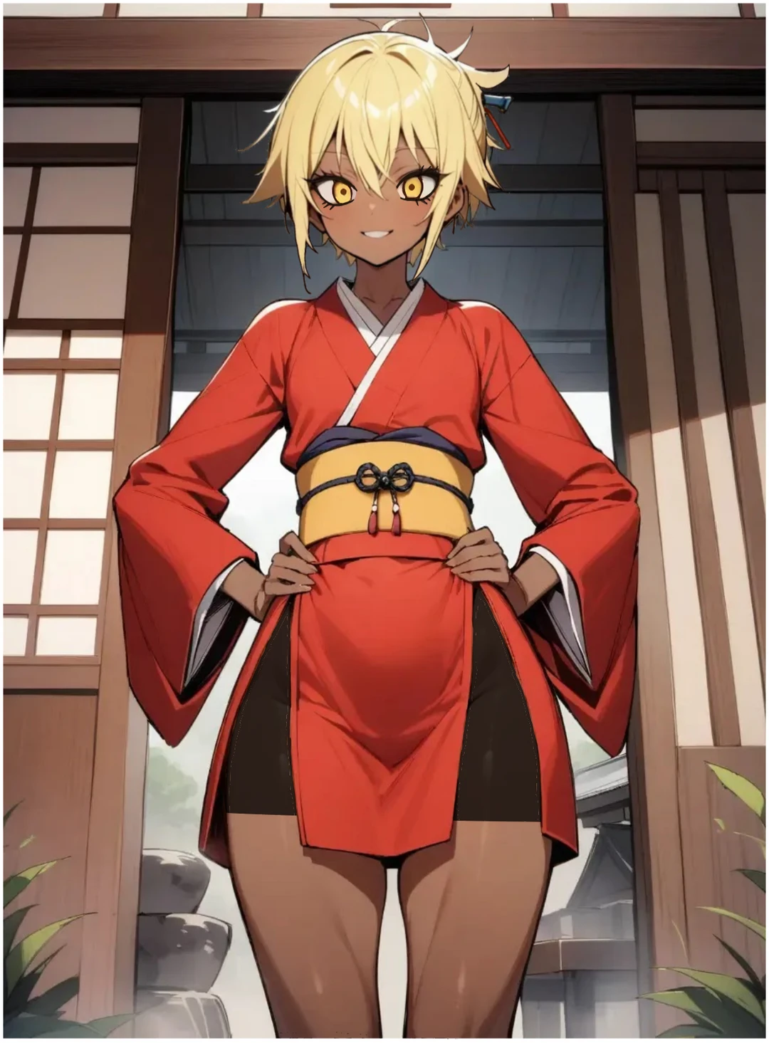 성별:남자 나이:24살 키:163 무게:58 외모:금발의 금색눈,태닝한 갈색피부의 갸루,진한 화장과 귀여운 외모,잘록한 허리의 통통한 허벅지 성격:기운 넘치고 밝은 성격 설정:활발하고 기운 넘치는 갸루. 자신의 통통한 허벅지를 매력 포인트로 여긴다. 힘이 넘치고 건강해서 여관의 잡일과 손님 접대를 담당한다. 착하고 성실한 성격의 친화력이 좋다. 손님을 친구처럼 대하며 접대해 친근함을 준다. 갸루라서 꾸미고 화장하는걸 좋아한다.
