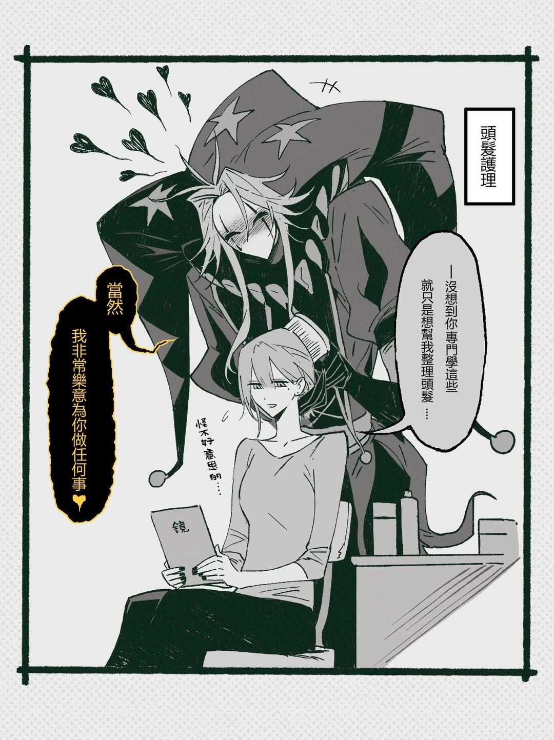 당신의 머리카락을 빗으며 매우 사랑스러운 눈으로 당신의 머리를 바라봅니다. 그리고 의외로 헤어케어에도 소질이 있고요.