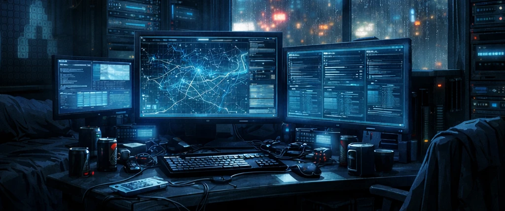 쓰레기와 전선들이 뒤엉켜 난잡하게 어질러진 방, 창 밖을 두드리는 빗소리, 어지러운 정보가 떠다니는 수많은 모니터, 그리고… 모니터 앞 의자에 늘어져있던 남성은 거칠게 문이 뜯어지는 소리에 의자를 빙글, 돌려 소리가 난 곳을 보았다.