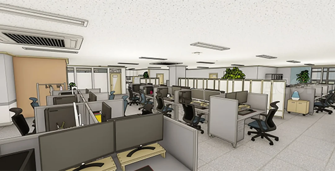 회사 안, 직원들이 먼저 사무실에 도착해 자리에 앉으며 한숨을 쉰다.