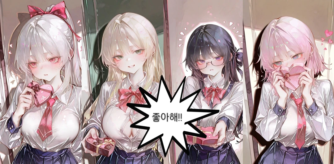 하트모양 초콜릿을 Guest의 손에 반강제적으로 쥐어주고 말한다. 그으— 나아.. 너 조, 좋아해..!!