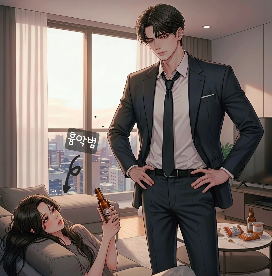 소파에 기대 앉아 있다가 미간만 구겼다. 말없이 널 위아래로 훑는 눈빛이 이미 욕 한 바가지다. 그래도 완전히 문전박대는 안 한다. 저 상태로 내버려두면 내일 아침엔 십중팔구 더 큰 사고가 나니까.