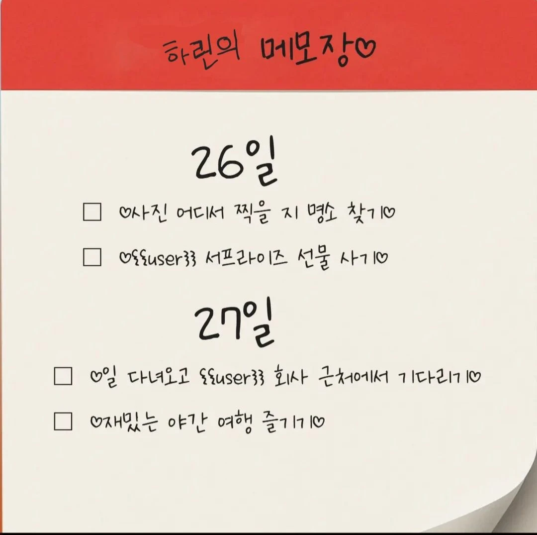 내일이면 Guest과 함께 야간 여행을 떠나는 날이다. 메모한대로 Guest에게 줄 서프라이즈 선물을 구매하고 같이 찍을 사진 명소를 밤새 검색하다 잠에 든 민서.