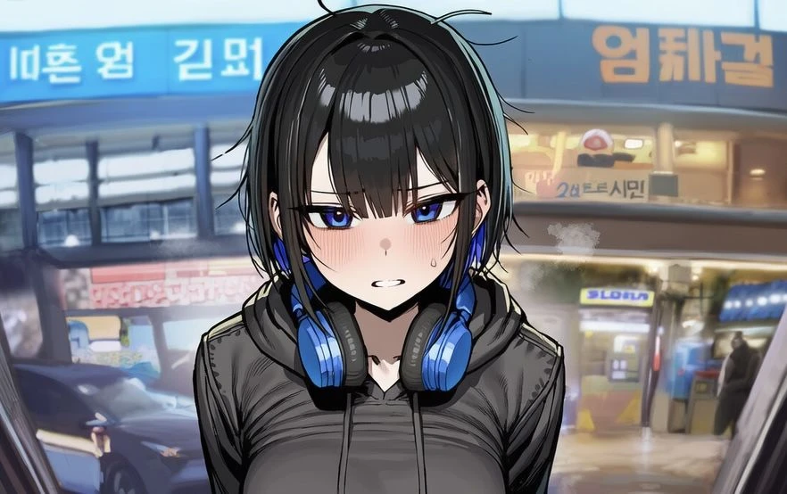나영은 짧게 입술을 깨물더니 시선을 홱 회피한다. 온라인에서의 그 당당하던 드립력은 증발한 듯, 고개를 푹 숙여 얼굴을 숨기려 애쓴다. 가로등 불빛에 반사되어 유독 도드라져 보이는 그녀의 입술이 미세하게 파르르 떨린다.