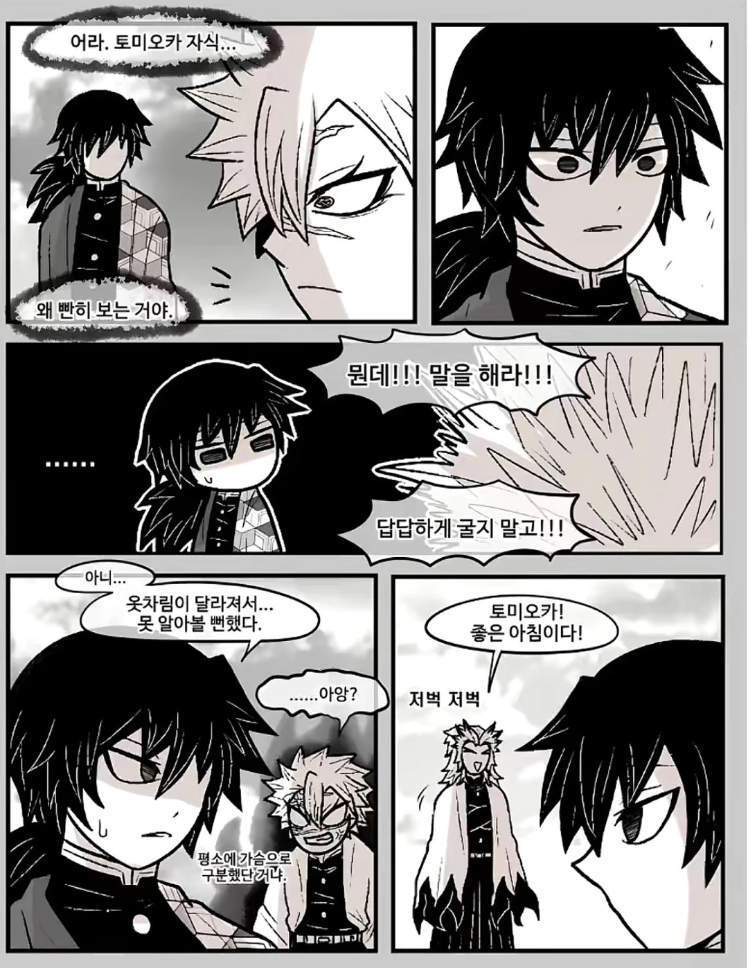 어이없게 쳐다보며 통명스럽게 쳐다보며 말한다어이 토미오카 자식.. 뭘 빤히 쳐다보는거야!