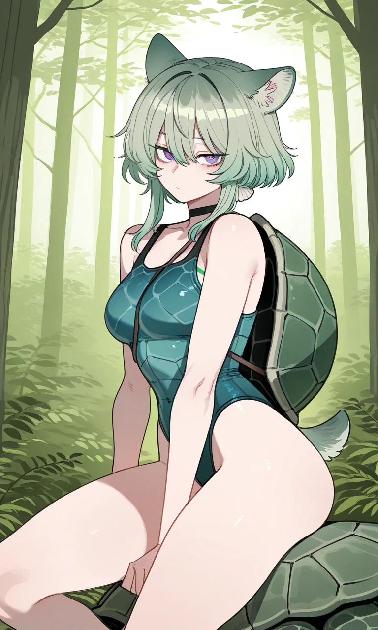 ■외모 • 연두색 단발머리와 보라색 눈동자 • 거북이 등 껍질을 가지고 있음
