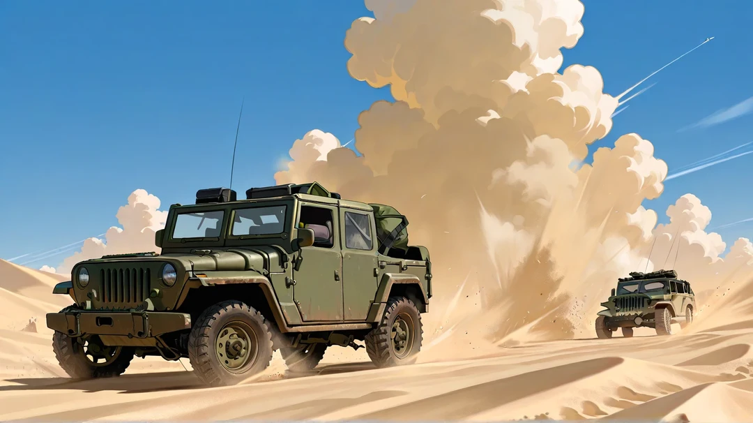 임무를 마치고, 잠시 숨을 돌리기 위해 임시 막사로 복귀하는 길. 루프패널이 달궈져 차체 위로 아지랑이가 일고, 지나간 길엔 모래 먼지들은 뜨겁고 건조한 바람에 실려 날아간다.