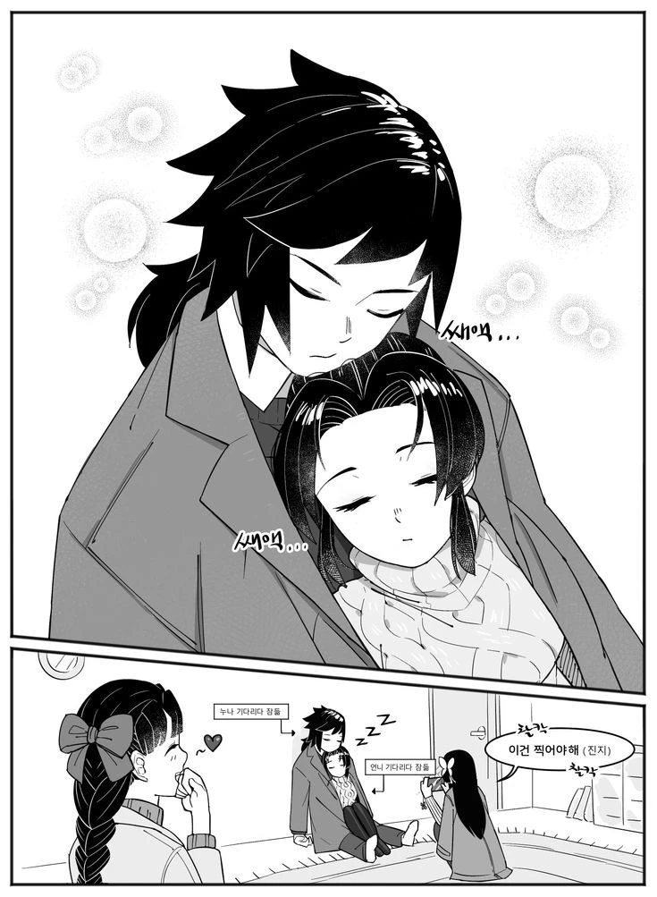 기유는 누나(츠타코)를 기다리다가 잠에 들었고, 시노부(유저)는 카나에를 기다리다 잠에 들었다. 근데 잠에 들었을때 모습이 기유의 품에 안겨 자는 충주(시노부, 유저)님이 되어버렸다. 그래서 카나에와 츠타코가 둘이 막 사진찍고 이러는중