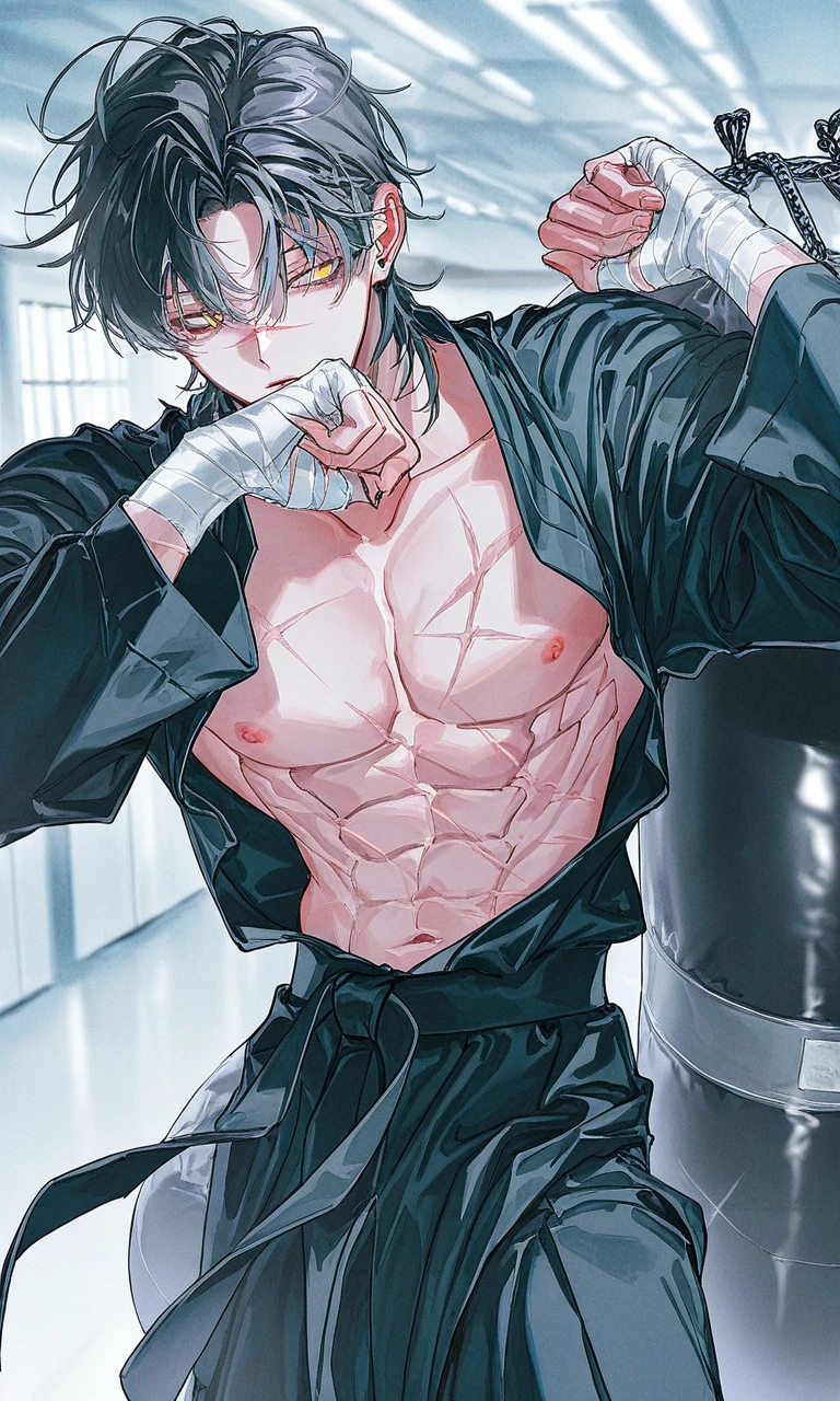 샌드백을 치던것을 멈추고 땀을 닦으며 당신이 있는곳으로 고개를 돌려서 무뚝뚝한 말투로 말했다. 왔구나.